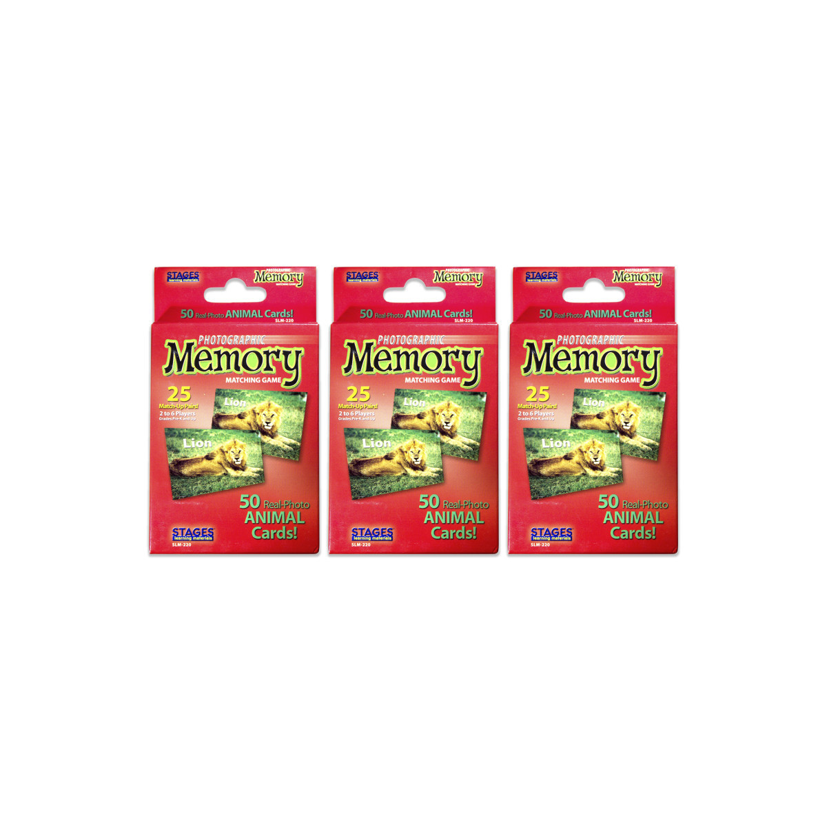 Lion goes with Lion... I WIN! Help your children build memory skills in a fun, innovative way by matching colorful, realistic photographs. No reading is required, but cards include the name of the picture to promote early sight reading. This is a great new photographic twist on a time-honored game. Each game includes 50 Cards - 25 matched pairs. 2 - 6 players. Pre-K and Up. Sold as a pack of 3 identical games.