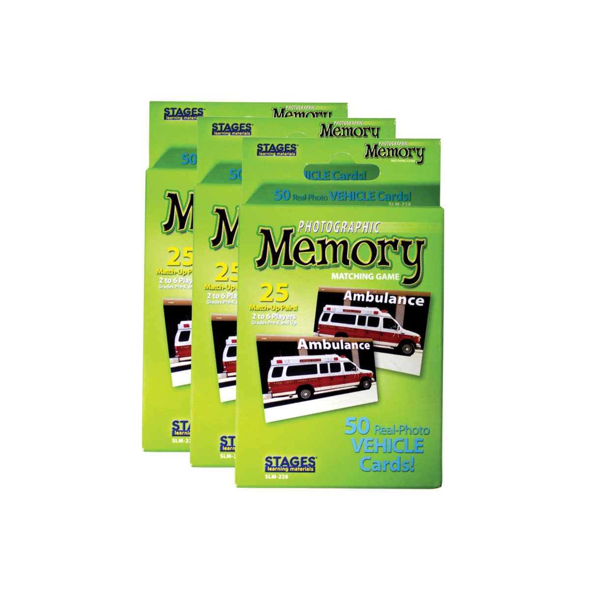 Ambulance goes with Ambulance... I WIN! Help your children build memory skills in a fun, innovative way by matching colorful, realistic photographs. No reading is required, but cards include the name of the picture to promote early sight reading. This is a great new photographic twist on a time-honored game. Each game includes 50 Cards - 25 matched pairs. 2 - 6 players. Pre-K and Up. Sold as a pack of 3 identical matching games.