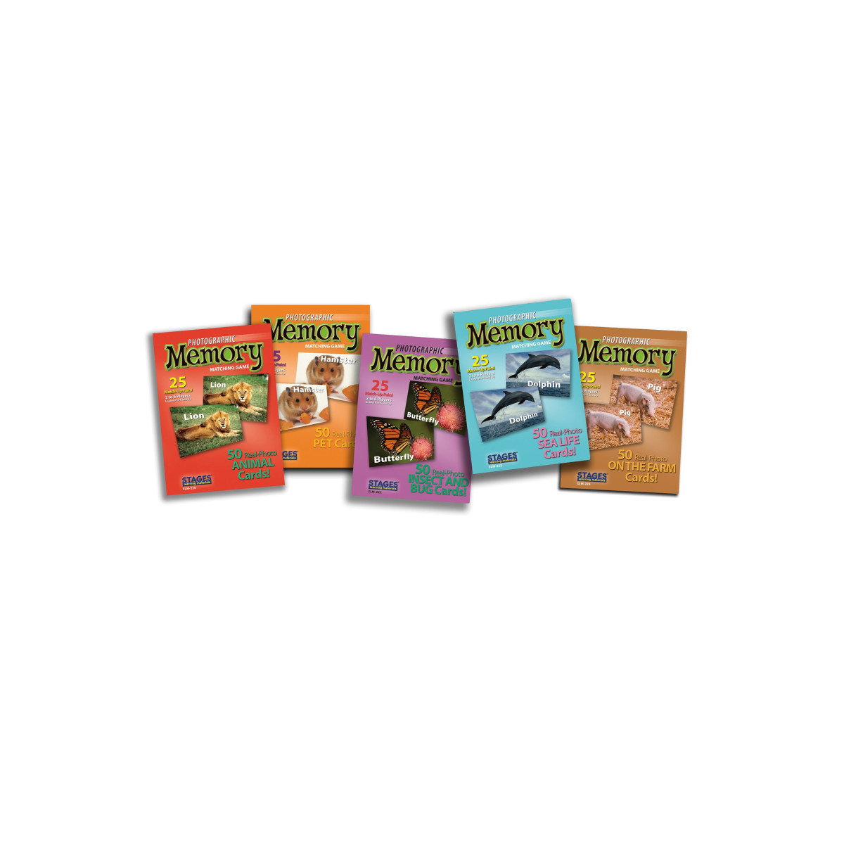 The Animal Memory Matching Game Set includes 5 animal themed memory games: Animal Memory, Pets Memory, Sea Life Memory, Insects & Bugs Memory, and On-The-Farm Memory.