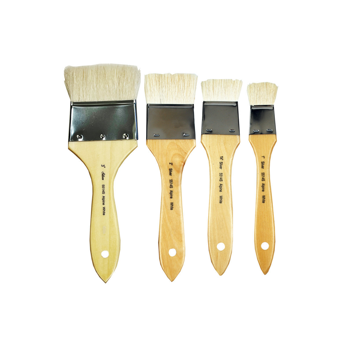 Alpine White™ wide wash and blend background brush set. With exceptional watercolor brushes that are unique in the market. Silvers goat hair wide wash brushes add dimension, color and wet on wet effects. Spread saturated color to the surface with the 5514S goat hair wide brush. Add the soft touch to the painting with these wide wash brushes. Multimedia brush set for all colors including oils, acrylic, watercolors, gouache, dyes, inks, fluid and flow acrylics, gels, drawing and pastel grounds, glue, varnish and lacquer. Silver Brush Ltd is owned by a 4th generation art materials family and proud of Silver Brush rich heritage in bringing quality supplies to artists and craftsmen throughout the world.