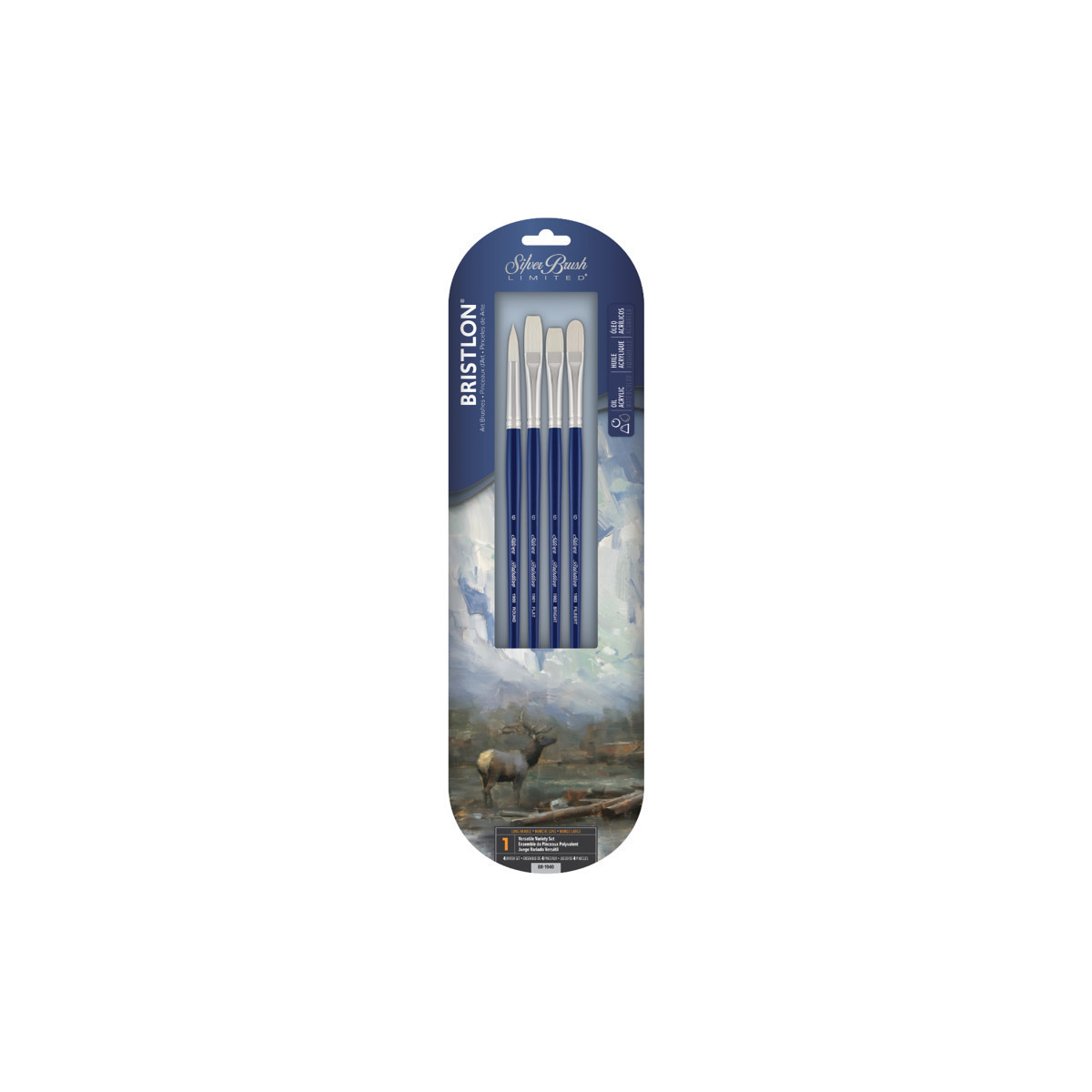 Silver Brush Bristlon product line was created for artists who use acrylic or oil paint. Each brush has excellent paint-holding capabilities and creates textured strokes on painting surfaces. This line offers stiff brushes with crisp edges. Silver Brush Bristlon acrylic and oil artist brushes are expertly crafted with a luxurious synthetic blend that imitates hog bristle. Each brush has a long wooden handle finished with an elegant nickel-plated brass ferrule that will not rust. This kit includes the Bristlon round, flat, bright, and filbert brushes, all in size 6. These brushes are ideal for line work, backgrounds, abstract designs, and rounded shapes. Long-handled brushes are best for easel painting. Each Bristlon synthetic brush is best paired with acrylic or oil paint. Silver Brush professional-grade acrylic brushes are designed to hold maximum color and are extremely durable. Enjoy watching your textured colors come to life.