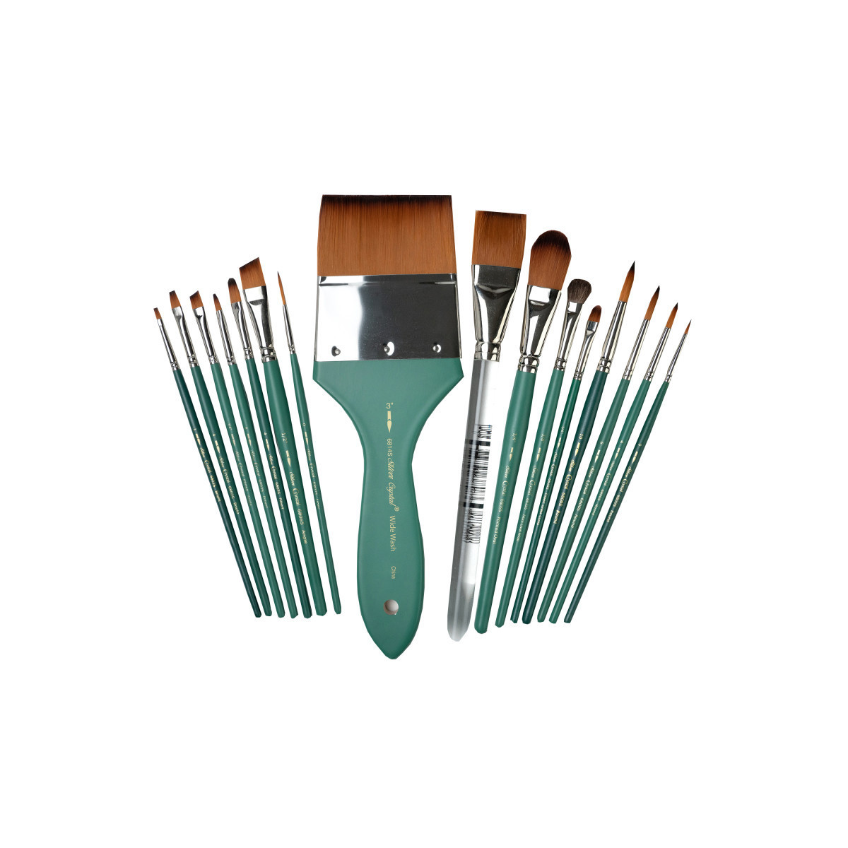 Quality artist's brushes for watercolor, acrylics, gouache, inks, dyes and all water media. Crystal™ brushes hold a generous amount of color that releases evenly and allows the brush to glide smoothly over paper. Adds layers and stroke over stroke. Resists puddling and drips. Carries color reliably from palette to painting surface. Manufactured with Silver Brush exclusive durable brown-tip golden filaments set into nickel-plated double crimped brass ferrules and fitted to beautifully balanced short matte teal handles. Crystal™ from Silver Brush, outlasts, outperforms, works harder than all other brushes in this class. Crystal™ synthetic brushes add durability and spring to each painting stroke. Crystal™ artist brushes are made to exacting detail. Perfect in acrylic, watercolors and all water media. Try Crystal in inks and dyes too. 6828S Crystal™, Filbert Grass Comb has a unique tip with separated filament that makes a scratch look. Use this brush for hair, Santa's beard, grass. For effortless natural painting of landscapes. 6800S: Round artist brushes are the most popular shape. Paint fine lines, detail, overall washes and stroke work. 6802S: Bright artist brushes have a square tip that make great lines and shading. Use the flat end to create geometrical shapes and designs. 6803S: Filbert artist brush has a rounded tip and makes for an organic curved mark. This brush will lay down color softly enough not to disturb the color underneath. 6806S: Angle artist brushes are made to exacting detail. The angle brush is perfect for quick and tight draw downs. Controls color on surfaces. Make a beautiful flower petal with just one stroke. A must for every artist's studio. Each set includes 16 different brushes in assorted shapes and sizes.