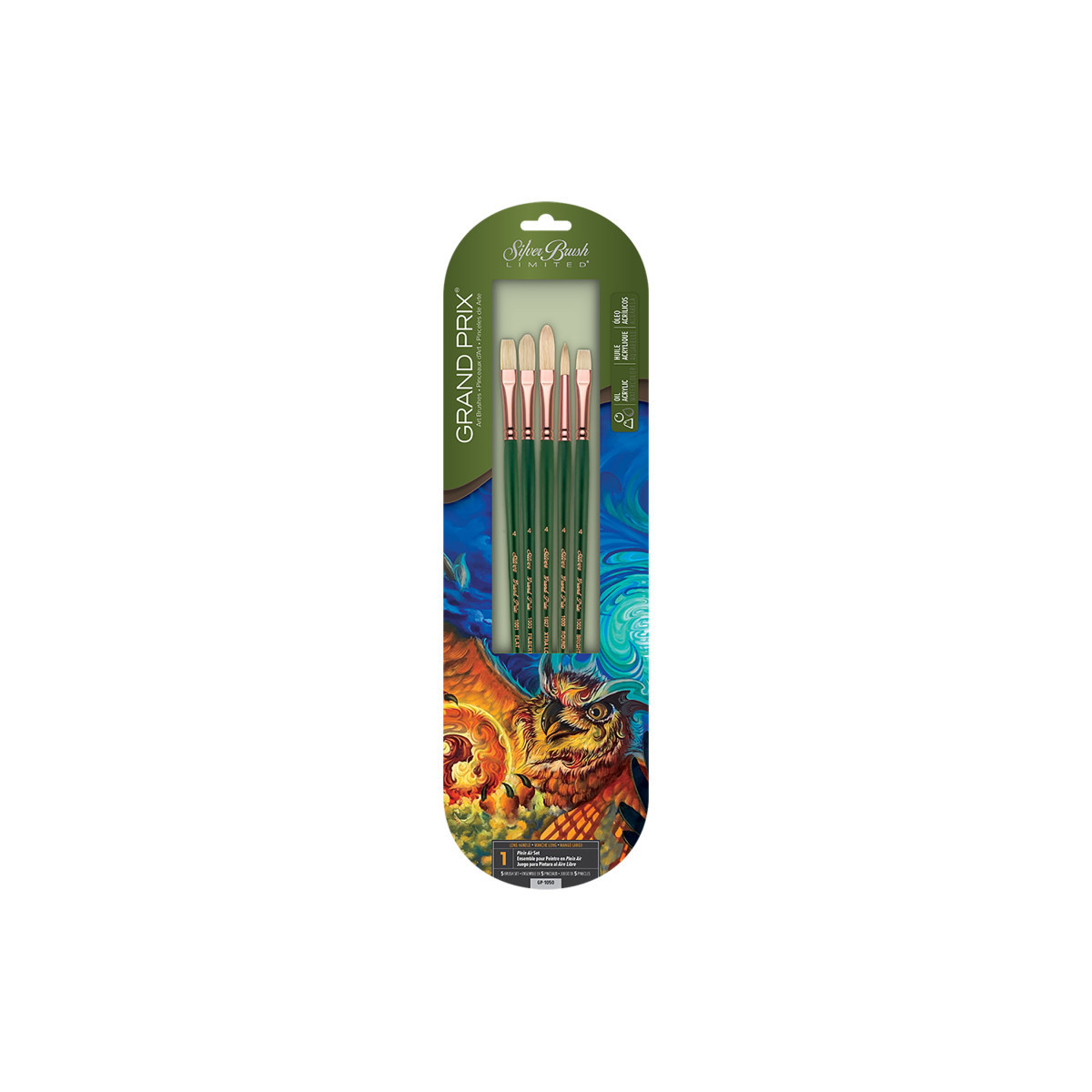 ART SET: Silver Brush superior Grand Prix set of paintbrushes includes round, flat, Bright, filbert, and extralong filbert brushes. This is the perfect set of oil brushes to create broad strokes, landscapes, abstract designs, floral images, and soft edges.