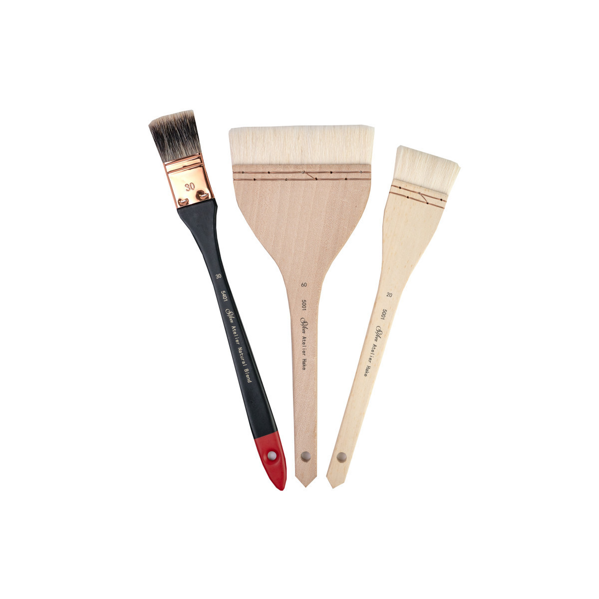 This natural hair-brush set builds on an artist's brush collection to include softeners and background blenders. Hake brushes give artists the ability to add wet on wet layers to any painting. Extra-long handle Badger & Synthetic Mottler brushes will help artists to reach edges on the largest canvas or surface. Product Features: Bristle brushes for varnishing, graining, transparent painting and priming. won't let you down, when adding layers to paintings, finish varnishing and painting furniture or just add the soft touch to edges and paintings. Made with an extra-long handle for extended reach on large canvases or murals. Designed with a rust proof copper-plated ferrule that is crimped, epoxy sealed and nailed to the handle for added durability when working with heavy bodied paints.