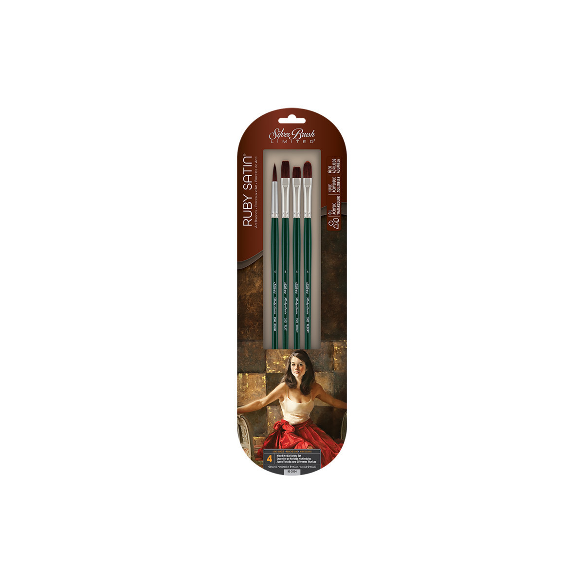 Each brush in Silver Brush Ruby Satin line is designed with synthetic fiber tips that imitate the firm snapback and holding capacity of mongoose hair. They are durable and firm enough to carry heavy liquids yet make smooth strokes. Silver Brush Ruby Satin professional artist brushes are expertly crafted with synthetic mongoose filament and are fit for rough painting surfaces. Each brush has a long handle that is finished with a sophisticated, nickel-plated brass ferrule. A mixed media variety set that includes size 4 round, flat, bright, and filbert brushes. Each Ruby Satin synthetic brush can be paired with heavy-bodied acrylic or oil paint. These professional paint brushes also work well with fluid and flow acrylics, proving they are extremely versatile. Enjoy the smooth, colorful strokes. Silver Brush Ltd is owned by a 4th generation art materials family and proud of Silver Brush rich heritage in bringing quality supplies to artists and craftsmen throughout the world. We delight in challenging the status quo and putting Silver Brush experience to work for you because Art is for Everyone!