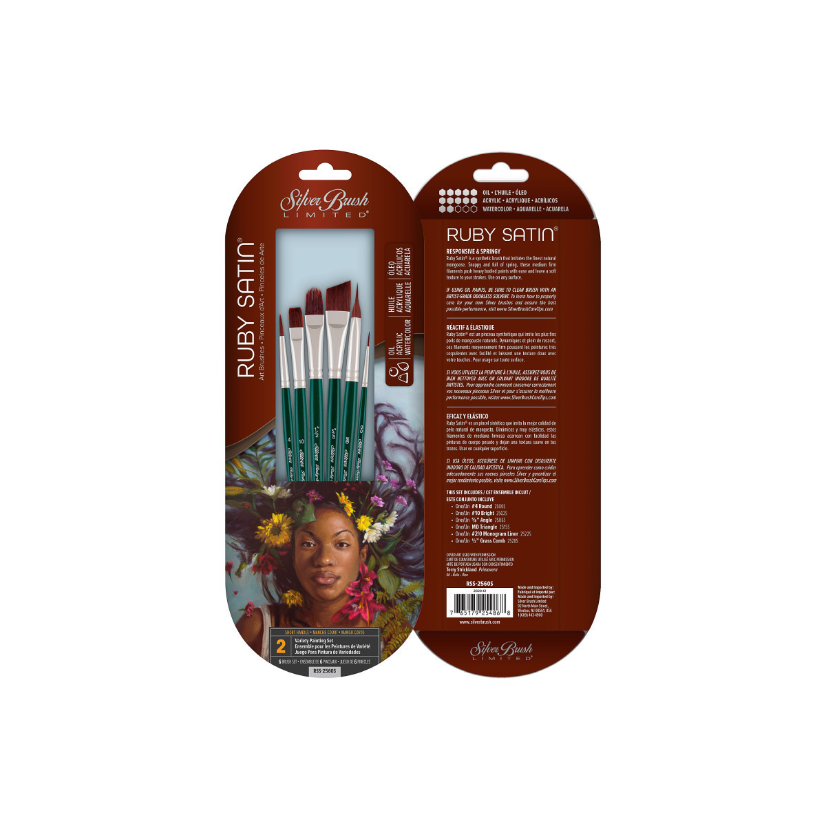 Silver Brush Ruby Satin line was created for artists who use a variety of paint types. Each brush is designed with synthetic-fiber tips that imitate mongoose. They are durable and firm enough to carry heavy liquids yet make smooth strokes. Silver Brush Ruby Satin professional artist brushes are expertly crafted with synthetic-mongoose filament and are fit for rough painting surfaces. Each brush has a short handle that is finished with a sophisticated nickel-plated brass ferrule. This Ruby Satin brush kit includes round, triangle, angled, Bright, monogram liner, and filbert comb brushes. This is the perfect brush set to create broad strokes, abstracts, crisp detail, signatures, and botanical or textured designs. Each Ruby Satin synthetic brush can be paired with heavy-bodied acrylic or oil paint. These professional paintbrushes also work well with watercolor and gouache, proving they are extremely versatile. Enjoy the smooth, colorful strokes. Silver Brush Ltd is owned by a 4th generation art materials family and proud of Silver Brush rich heritage in bringing quality supplies to artists and craftsmen throughout the world. We delight in challenging the status quo and putting Silver Brush experience to work for you because Art is for Everyone!