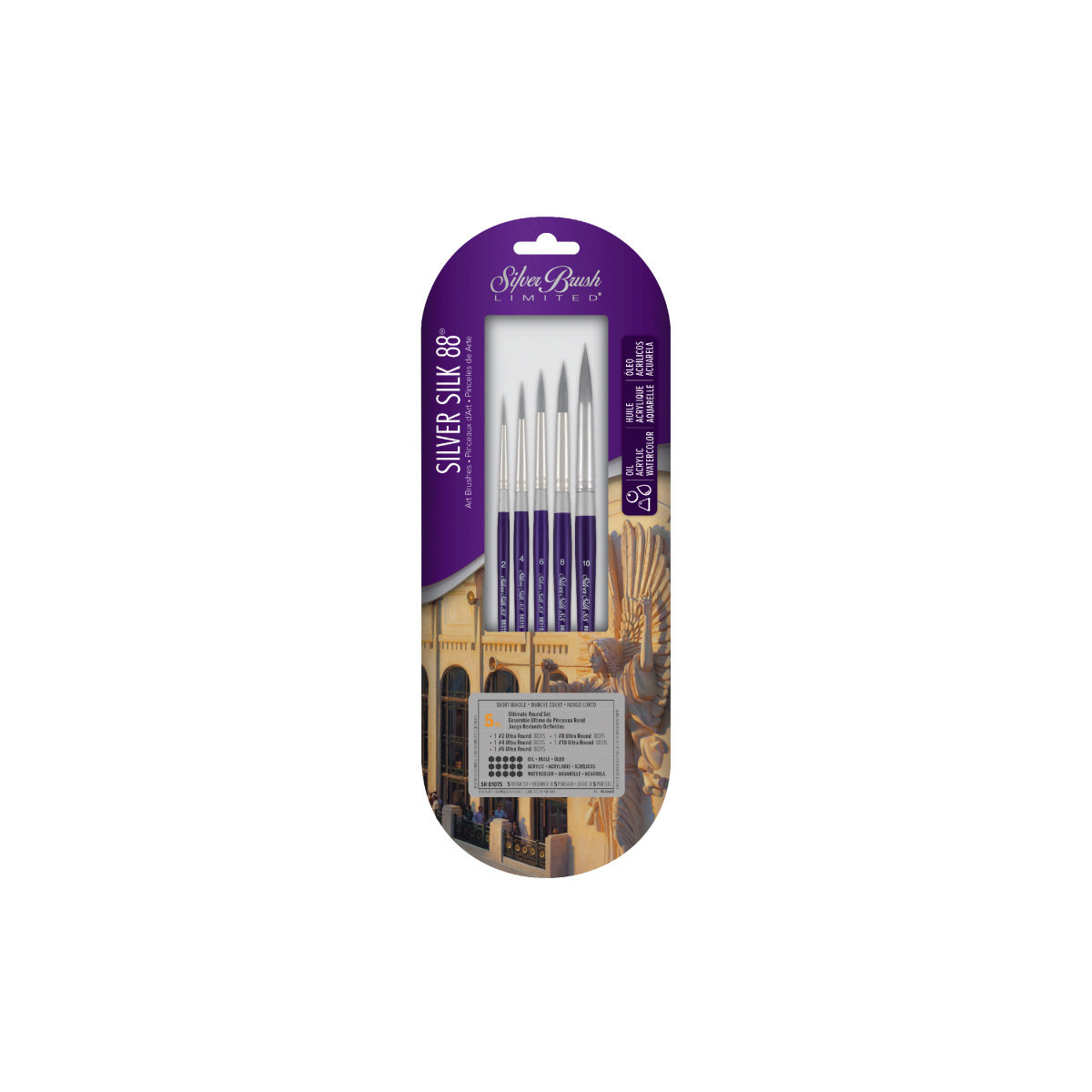 Each brush in Silver Brush Silver Silk line is designed with synthetic fiber tips except for Silver Brush Mini Mop, which is made with dressed white goat hair. Silver Brush durable Silver Silk brushes exhibit maximum color absorbency and control. Silver Brush Silver Silk professional artist brushes are made with superior Silver Taklon synthetic filament or white goat hair and display exceptional wear resistance. Each artist painting brush has a handle that is sophisticatedly finished with lacquer. Includes 1 #2 Ultra Round, 1 #4 Ultra Round, 1 #6 Ultra Round, 1 #8 Ultra Round, and 1 #10 Ultra Round Brush. Each Silver Silk goat hair or synthetic brush can be paired with fluid and interference acrylic or gouache. These paintbrushes also work well with watercolor, inks, dyes, and heavy body paint, proving that they are extremely versatile. Enjoy the controlled, colorful strokes. Silver Brush Ltd is owned by a 4th generation art materials family and proud of Silver Brush rich heritage in bringing quality supplies to artists and craftsmen throughout the world. We delight in challenging the status quo and putting Silver Brush experience to work for you because Art is for Everyone!