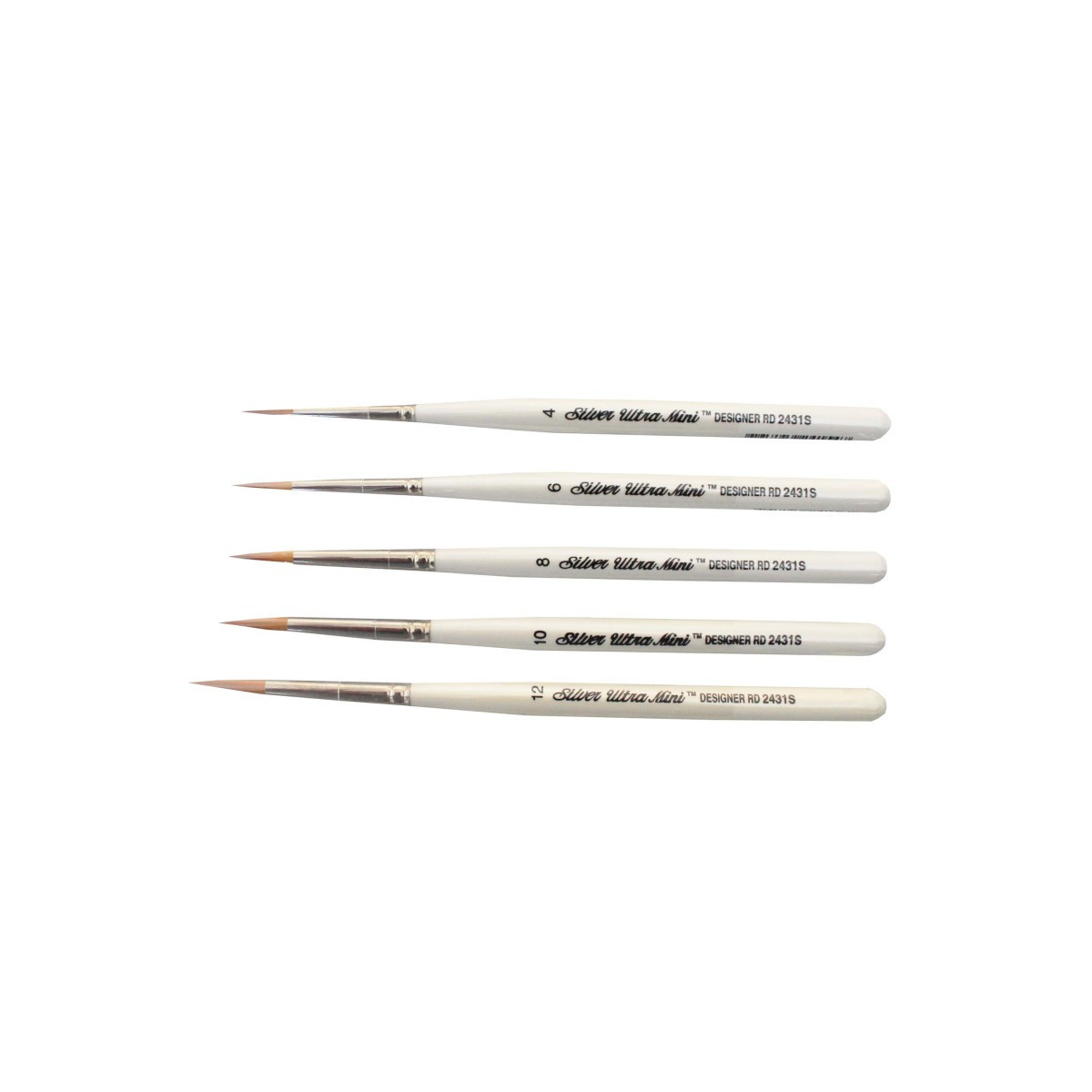 This set includes 7 ultra round brushes in the popular sizes for every creative talent: #2, #4, #6, #8, #10, #12, #14. Brush# Ultra Mini® Ultra Round (Designer Round) shape. Ultra Mini®- Sharp pointed round brush, but with a longer length out tip. Hold's more paint. The Ultra Round on Silver Brush exclusive Comfort Grip® handle, adds uninterpreted lines and fine detail without reloading as often. Add dots, dashes and squiggles to your artwork with one stroke. Make miniature florals, still life, botanical, florals, abstracts, designs of all types with thick and thin marks. A truly unique series only Silver Brush Ltd. Paint Type: Watercolors, Gouache, Acrylic, Fluid and Flow Acrylics, Casein, Tempera.
