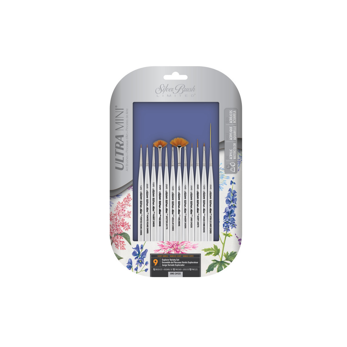 These brushes were created for artists who use watercolor or acrylic paint. They feature golden Taklon filaments mounted onto pearly-white handles. Their ultrafine tips are good for creating tiny details and offer lots of control. Silver Brush Ultra Mini paintbrushes are expertly crafted with luxurious and precise golden Taklon filaments. Each brush has a short pearly-white Comfort Grip handle that is finished with a sophisticated nickel-plated brass ferrule. This kit includes the Xtra Long Liner 20/0, Filbert 10/0, Pointed Round 20/0, Angular 12/0, Fan 20/0, Script Liner 20/0, Spotter 20/0, Shader 10/0, Pointed Round 12/0, Monogram Liner 20/0, Fan 12/0, and Grass Comb 12/0. Each Ultra Mini brush can be paired with both watercolor and acrylic paint, proving that it is versatile. It will hold the right amount of color for precise details. Enjoy the controlled, colorful strokes. Silver Brush Ltd is owned by a 4th generation art materials family and proud of Silver Brush rich heritage in bringing quality supplies to artists and craftsmen throughout the world. We delight in challenging the status quo and putting Silver Brush experience to work for you because Art is for Everyone!