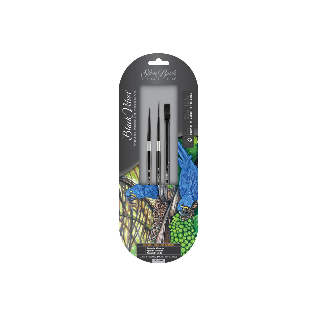 Silver Brush Black Velvet brushes were created for watercolor artists and skilled hobbyists. Each Black Velvet brush is soft enough to add color without disturbing previous layers but firm enough to lift color when needed. Silver Brush Black Velvet professional watercolor brushes are expertly crafted with a luxurious blend of squirrel hair and black synthetic fiber. Each brush has a short handle that is finished with sophisticated black lacquer. This kit includes the Black Velvet round brush size 0, Black Velvet script liner size 1 and Black Velvet square wash size 1/4. These brushes are ideal for backgrounds, line work, and scrollwork. Silver Brush Black Velvet brushes are best paired with watercolor.