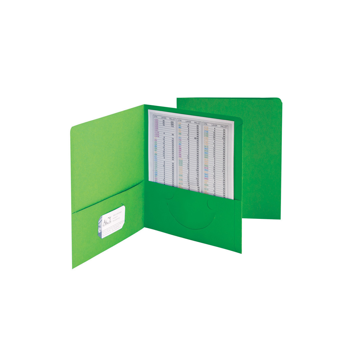 Large pockets safely hold documents, photos or certificates for easy transport while keeping the material immediately accessible. Reinforced at the sides and closed at the center, the left pocket holds a business card. Made of green textured stock. Each folder is 9-3/4" W x 11-1/2" H and holds 100 letter sized sheets. Each pack contains 25 folders.