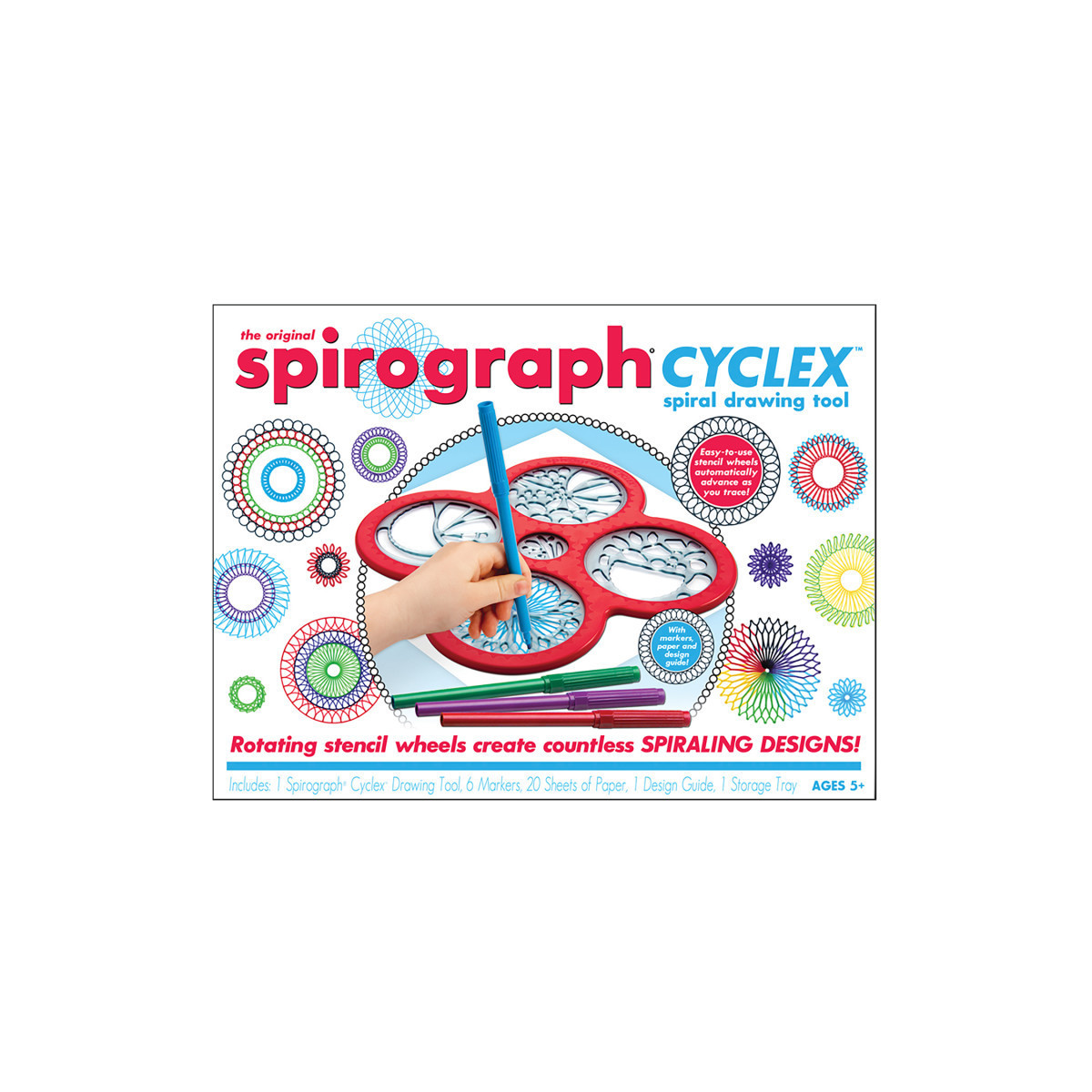 The amazing Spirograph Cyclex drawing tool makes it simple for kids of all ages to create intricate and beautiful spiral art designs and patterns. The unique rotating stencil wheels of the Cyclex automatically advance as you trace making it easy and fun to create incredible detailed designs. The design wheels are fully encased inside the Cyclex, which prevents accidental slipping of the gears, making it perfect for younger artists. Works with the included design markers as well as with your own pens, markers and crayons. Contents: Spirograph® Cyclex™ Drawing Tool, with over 80 different stencil design options, 6 Art Markers, Storage Tray, Design Guide, and 20 Sheets of Design Paper.