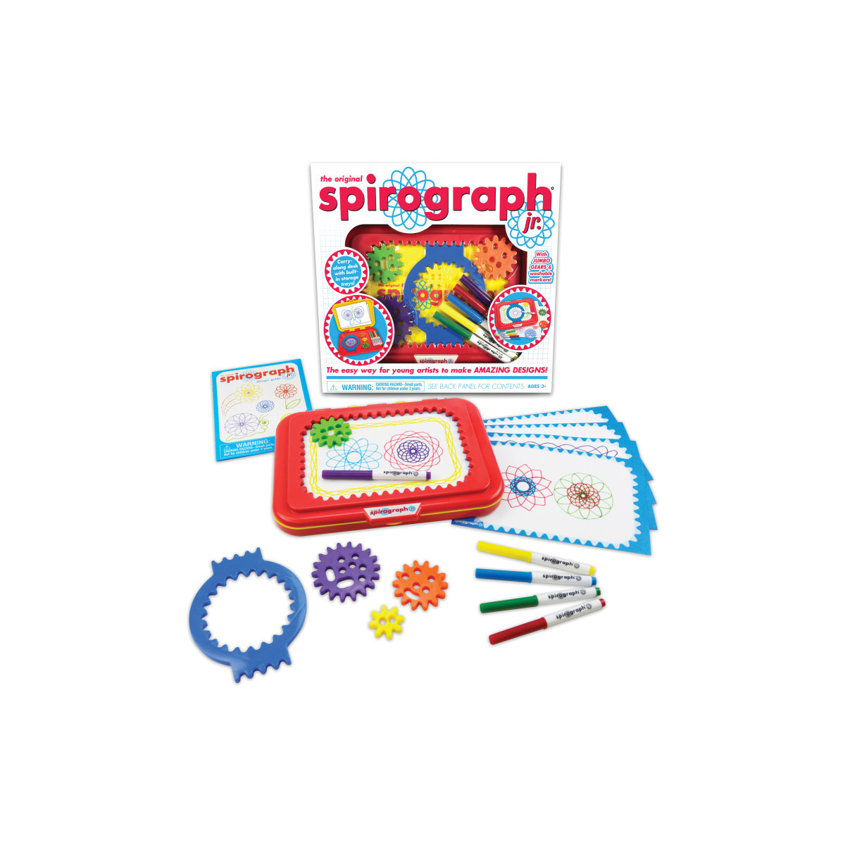 Calling all aspiring artists! Now even the youngest creative minds can make amazing designs with the Spirograph Jr. design set! Jumbo-sized pieces make creating Spirograph art fun and easy for little hands, and an easy-to-carry drawing tablet doubles as a work station and handy storage case to keep everything neat. The set includes easy-to-use gears, 5 washable markers, 24 pages of design paper and handy instruction guide. Start their minds spinning with Spirograph Jr.!