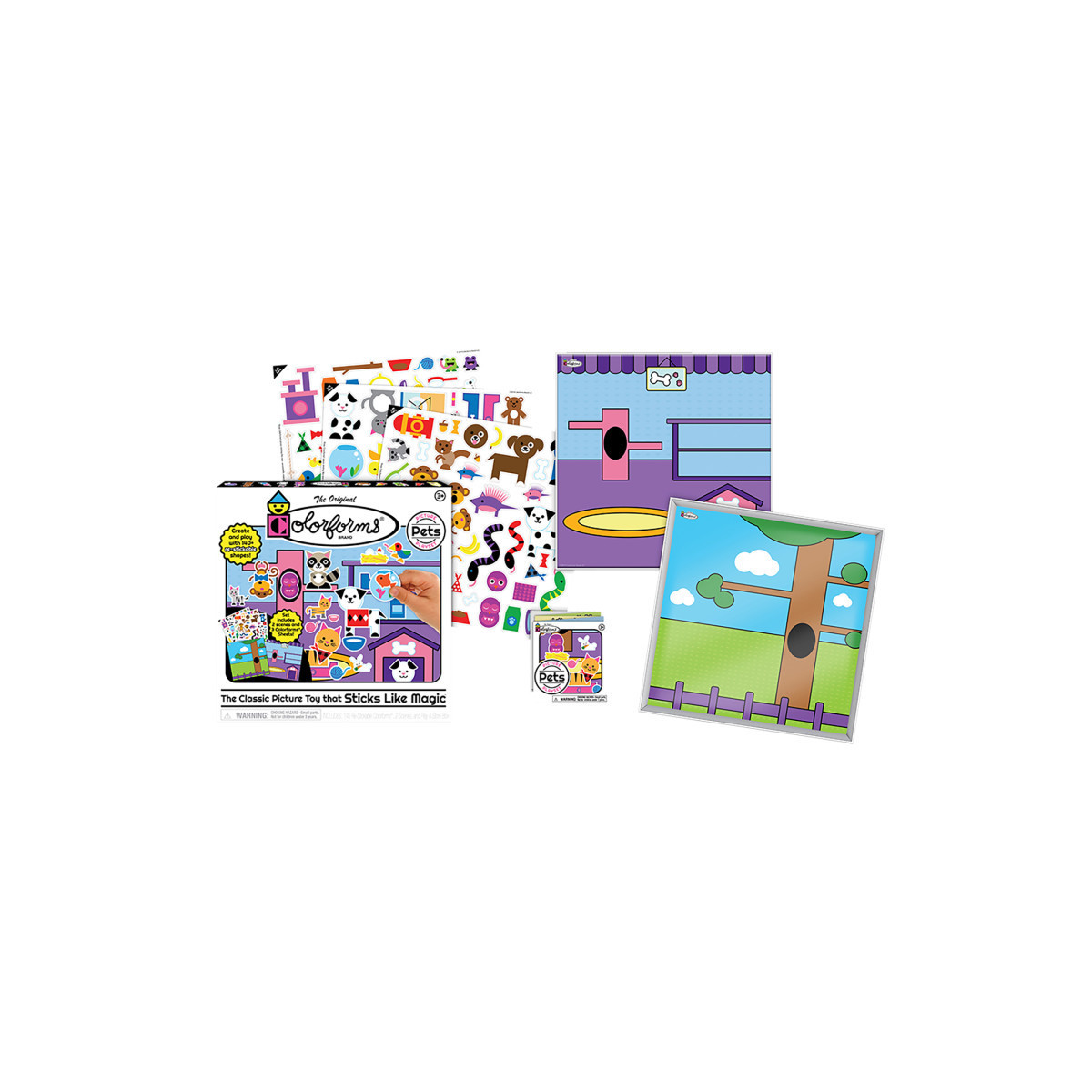 Play and learn with the Colorforms Pets Picture Play Set! Mix and match the adorable pieces to take care of, dress up, and play with your own Colorforms pets! Re-stick the pieces on each scene to imagine your own fun stories over and over again. The set includes 2 colorful play panels, 3 sheets with over 140 re-stickable Colorforms pieces, fold-out guide with fun learning ideas, and a sturdy box to store everything neatly.