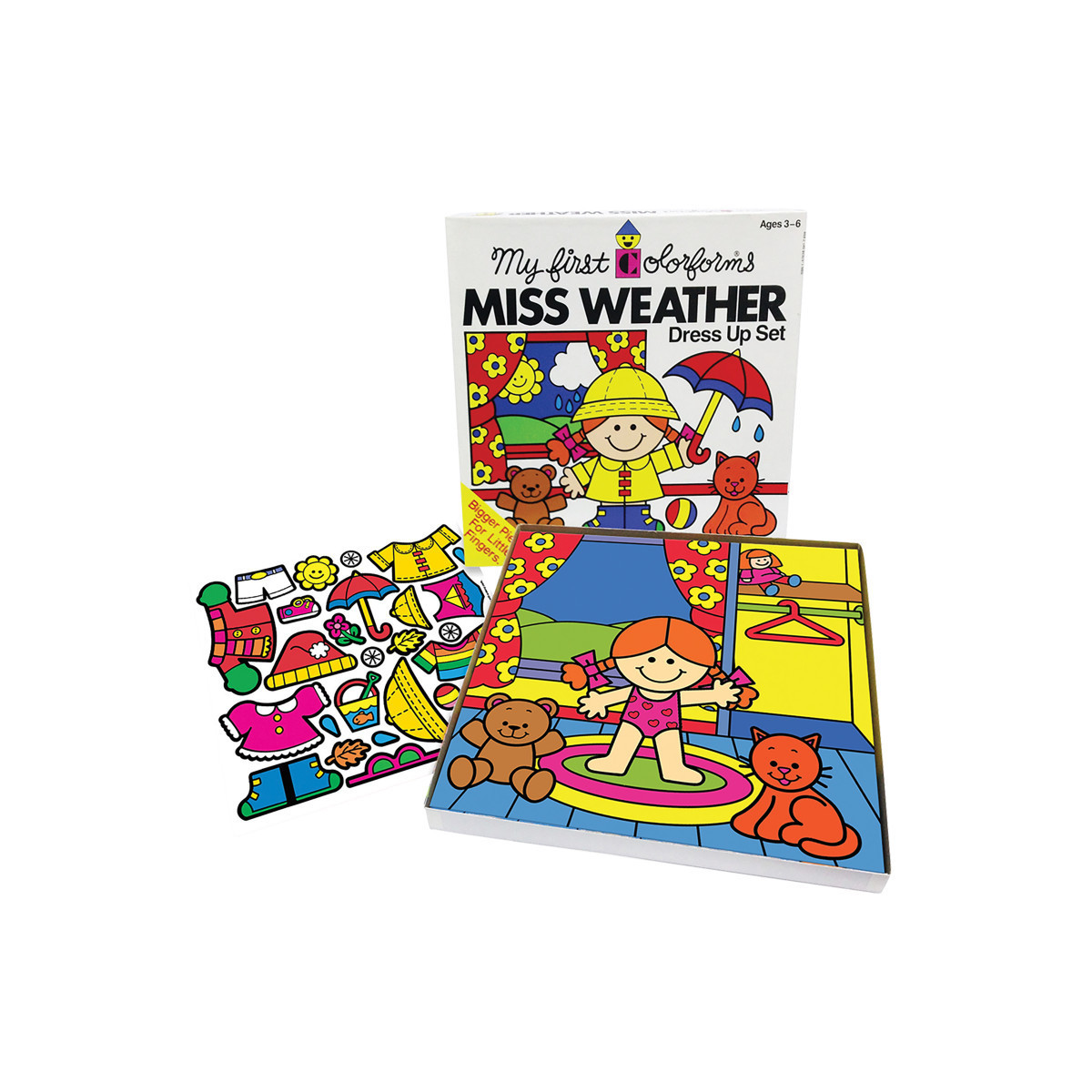 Summer, Fall, Winter, Spring... Dress up Miss Weather in fun and colorful outfits for all seasons! Bigger pieces for little fingers make this set the perfect way to introduce your little one to the world of Colorforms. No cutting, no glue, no mess — Colorforms stick like magic! Colorforms play sets offer educational, imaginative play that encourages creative expression, concentration skills, understanding spatial relationships, as well as fine motor skill development. It's more fun to play the Colorforms way! Contents: 28 re-stickable Colorforms pieces, Colorful playboard with dress-up figure, and Storage box.
