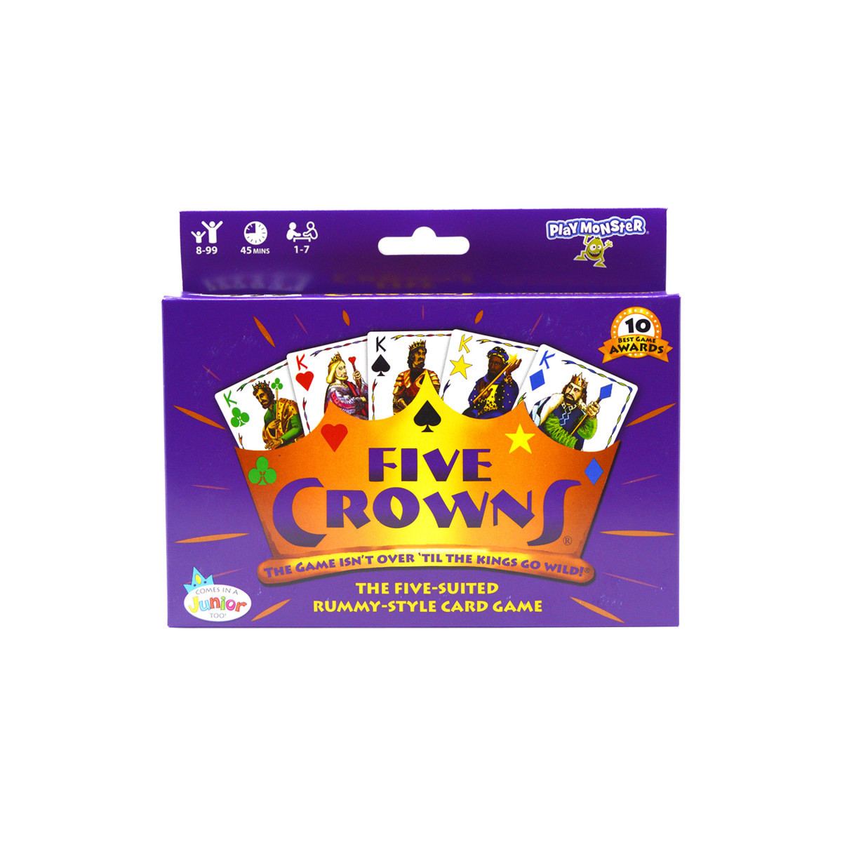 Five Crowns is a five-suited rummy-style card game that appeals to a wide array of card players! This award-winning, classic game is a quick favorite features a unique double deck that contains five suits: spades, clubs, hearts, diamonds and stars! This special deck makes it easier to arrange your entire hand into books and runs. The rotating wild card keeps players on their toes! The game begins with three cards and 3s are wild, the next round has four cards and 4s are wild, and so on 'til the Kings go wild! Make the right combinations, be the first to go out, then watch players scramble as they get one last chance to cut their losses! It's a fun and addictive family game that provides great interaction for kids and adults! For 1 to 7 players. Contents: 116 Cards and Rules.