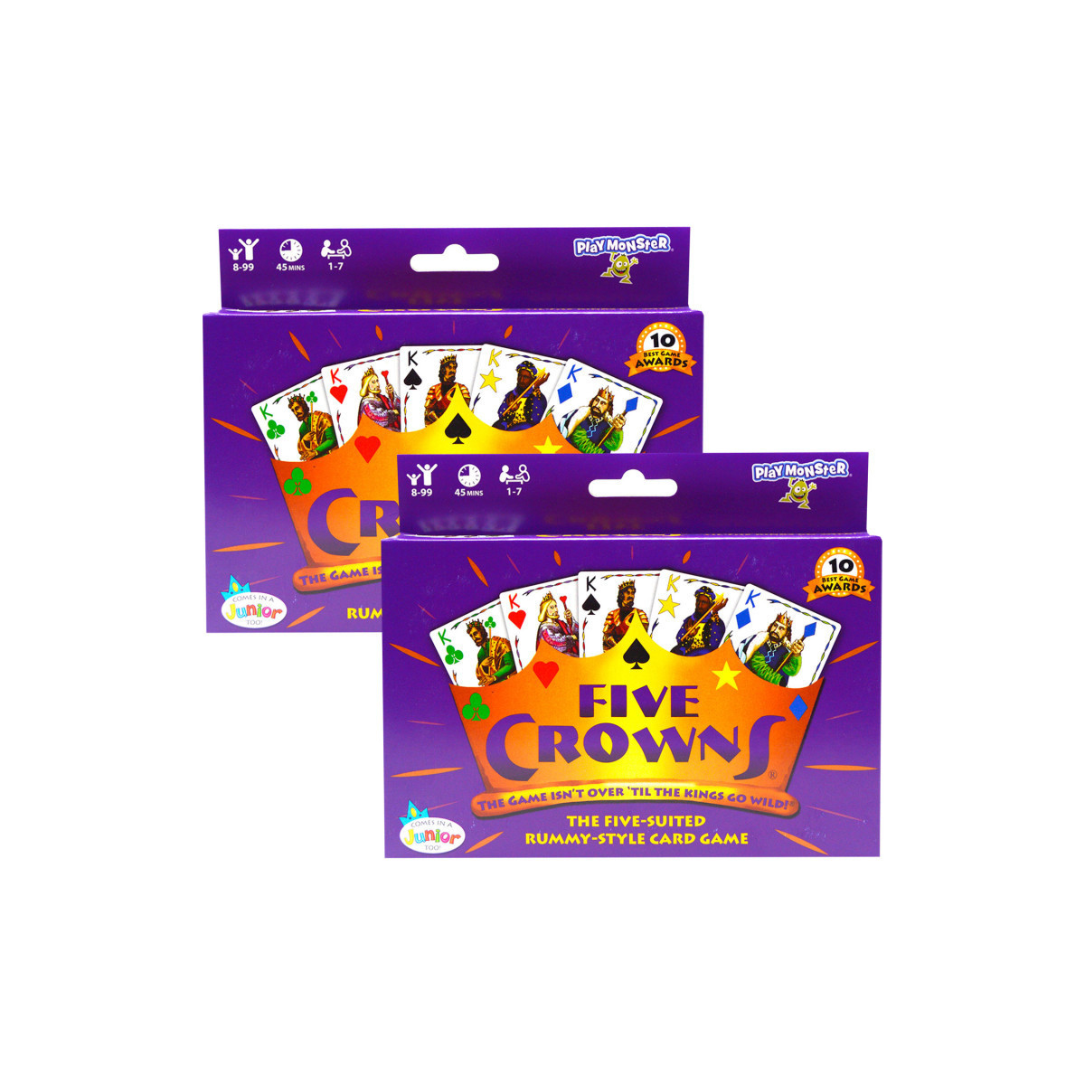 Five Crowns is a five-suited rummy-style card game that appeals to a wide array of card players! This award-winning, classic game is a quick favorite features a unique double deck that contains five suits: spades, clubs, hearts, diamonds and stars! This special deck makes it easier to arrange your entire hand into books and runs. The rotating wild card keeps players on their toes! The game begins with three cards and 3s are wild, the next round has four cards and 4s are wild, and so on 'til the Kings go wild! Make the right combinations, be the first to go out, then watch players scramble as they get one last chance to cut their losses! It's a fun and addictive family game that provides great interaction for kids and adults! For 1 to 7 players. Sold as a pack of 2 identical games.