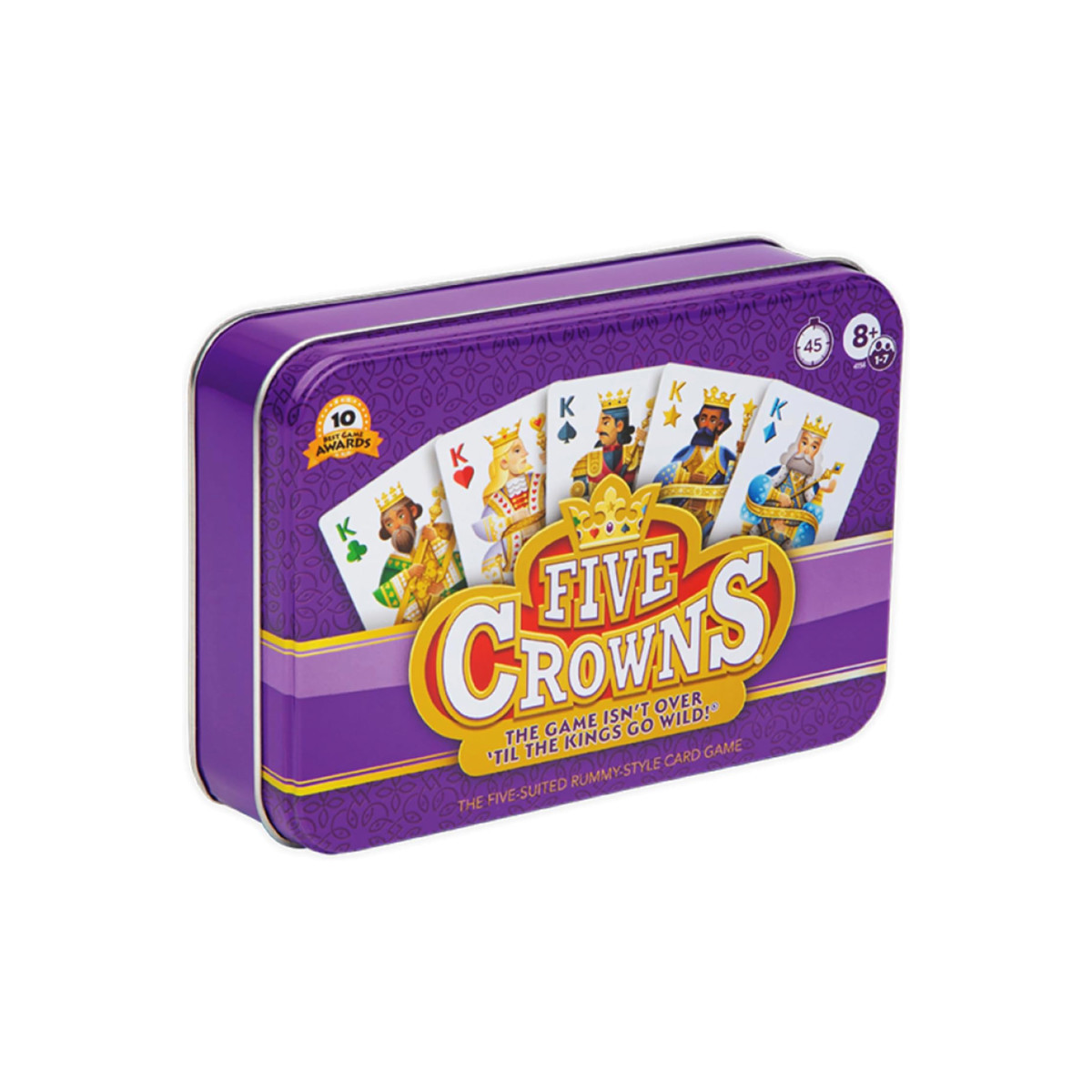 Five Crowns is the perfect game that everyone from friends to the whole family will enjoy playing over and over again! This award-winning game features a one-of-a-kind deck and rotating wild cards that keep everyone on their toes! Each round provides different card hands and different ways to play various combinations to keep your score low and your opponents’ scores high. And the game isn't over 'till the Kings go wild! For 1 to 7 players, ages 8 and up. Includes 116 Cards, Scorepad, and Rules.