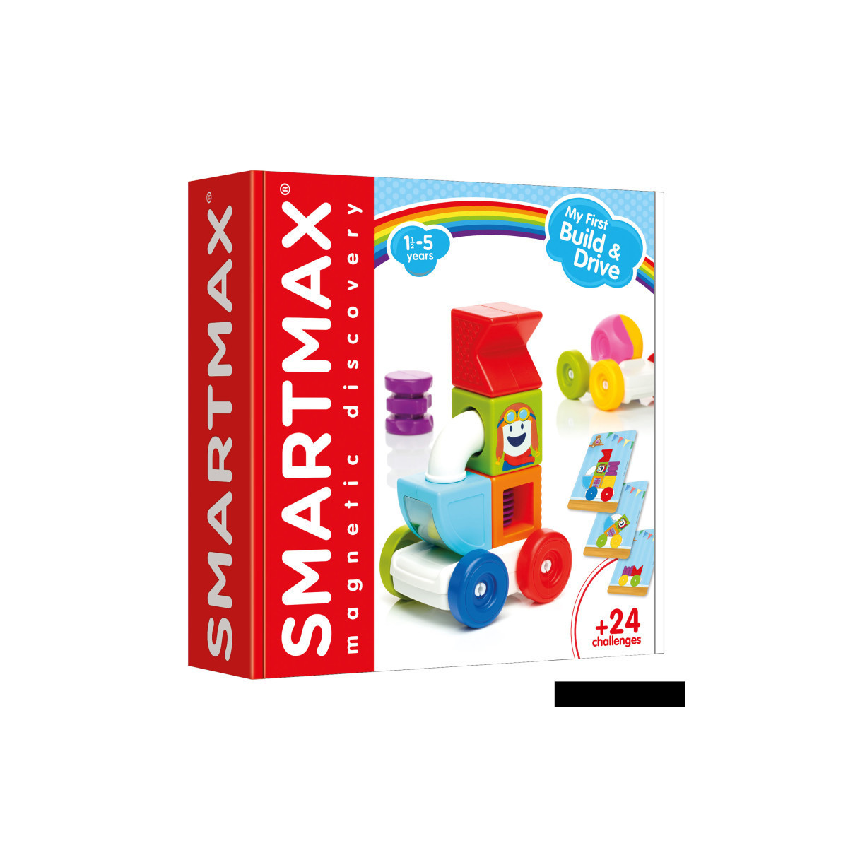 Time to get things rolling! My First Build & Drive takes you on a creative journey. It is a 2-in-1 playset: Toddlers as young as 18 months can build and play or pre-schoolers from the age of 2.5 can try and rebuild one of the 24 challenges. Turn the vehicle upside down for more difficult building challenges! Learn all about magnetism, colors, shapes, angles and concepts such as above, below, up and under. Combine My First build & Drive with all other SmartMax sets and practice fine motor skills, balance, and fantasy. Hours of build- and play fun!