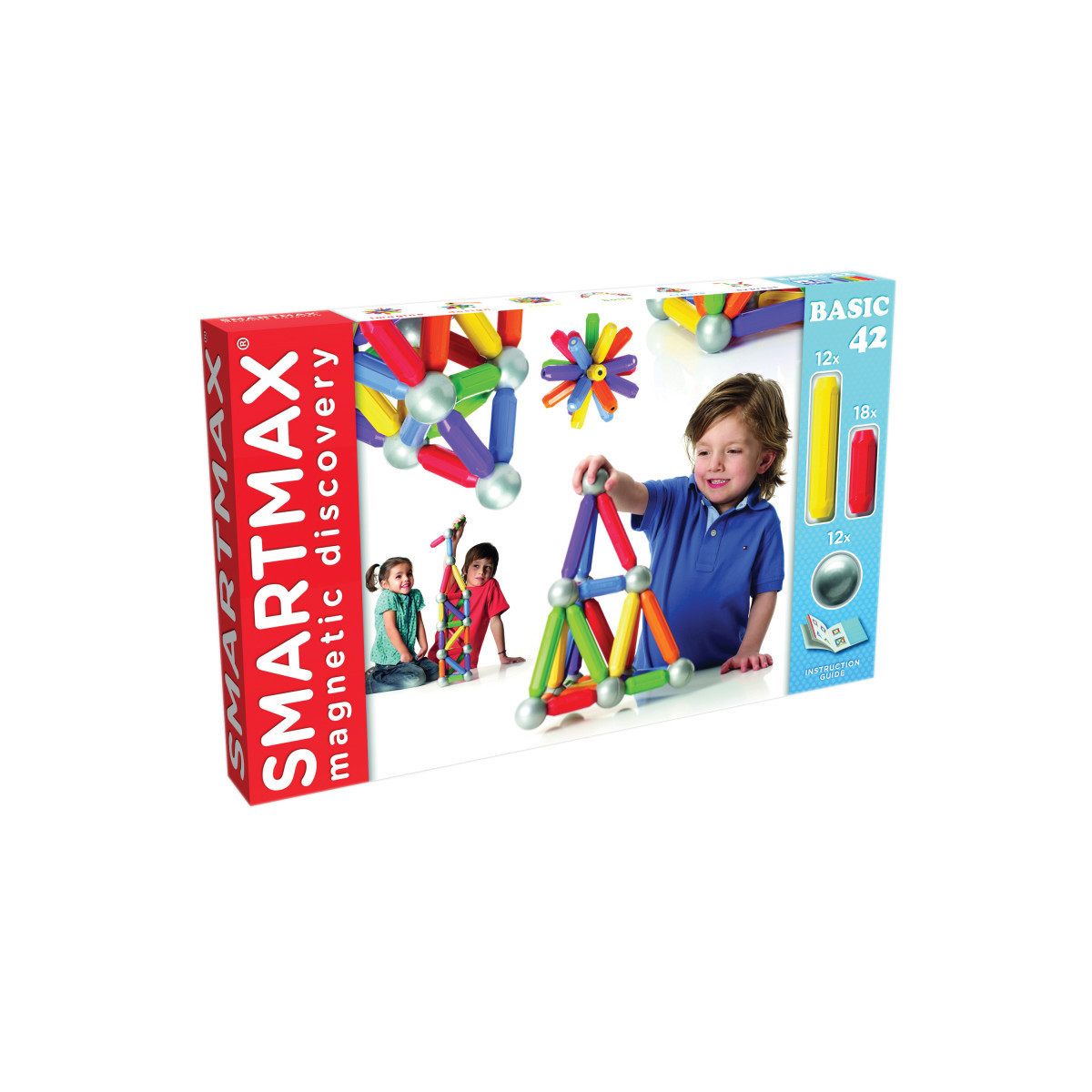 Have fun building incredible structures with SmartMax! SmartMax allows children to explore magnetism safely. The oversized pieces are specifically designed for handling by young kids as they learn about the effects of magnetic attraction and repulsion, while older children will have fun using the pieces to construct towers, bridges and other creations. They magnets are strong enough to carry up to 60 times their weight! The Basic 42 set includes 18 short magnetic bars, 12 long magnetic bars, 12 magnetic balls and a guide to build models.
