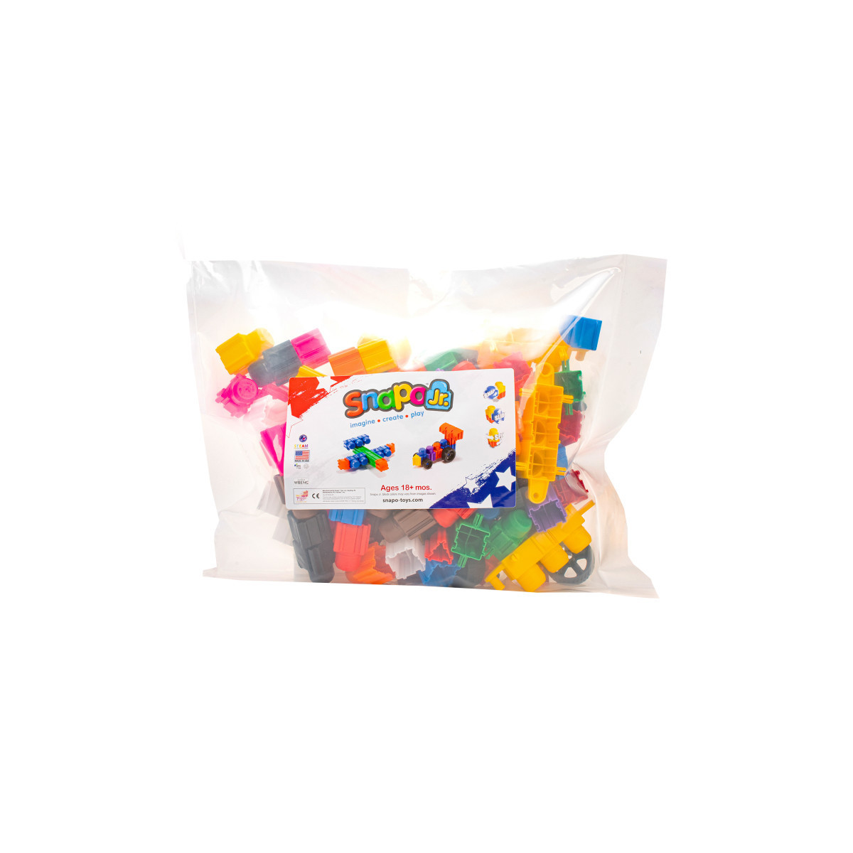 What sets Snapo apart (besides being 100% MADE IN USA) is its commitment to sustainability. Snapo blocks are 100% recyclable, the company recycles its own clean, FDA Food Grade material, ensuring nearly zero waste production. Moreover, Snapo blocks are BPA-free, non-magnetic, washable, and have undergone rigorous safety testing, meeting all ASTM Safety Standards. This dedication to safety and eco-friendliness makes Snapo a choice that parents can trust. This kit includes 125 pieces: Standard Blocks, Wheels, Propellors, Specialty Blocks (Axels, slopes, etc.).