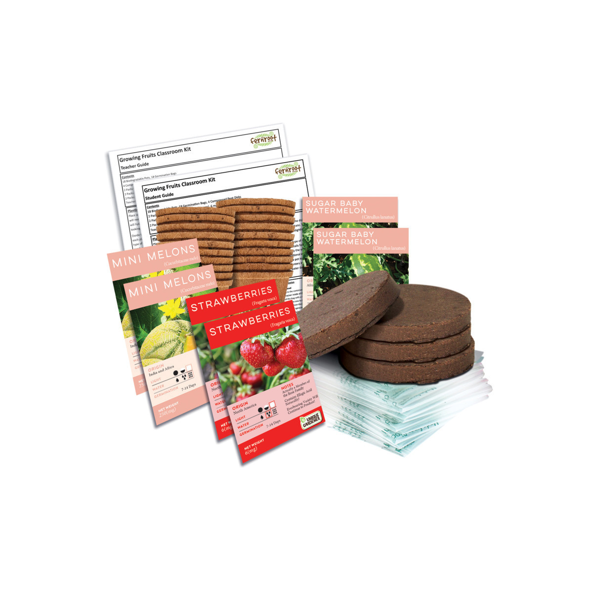 Sprout seeds for 3 kinds of fruits and plant the seedlings and pot in the garden to grow and harvest fruit. Comes with everything you need- just add water! For 18 students or groups. Contents include: 18 Biodegradable Pots, 18 Germination Bags, 2 Compressed Peat Disks, Strawberry Seed Pack 6mg., Mini Melon Cantaloupe Seed Pack 150mg., Sugar Baby Watermelon Seed Pack 400mg., Growing and Experiment Guide.