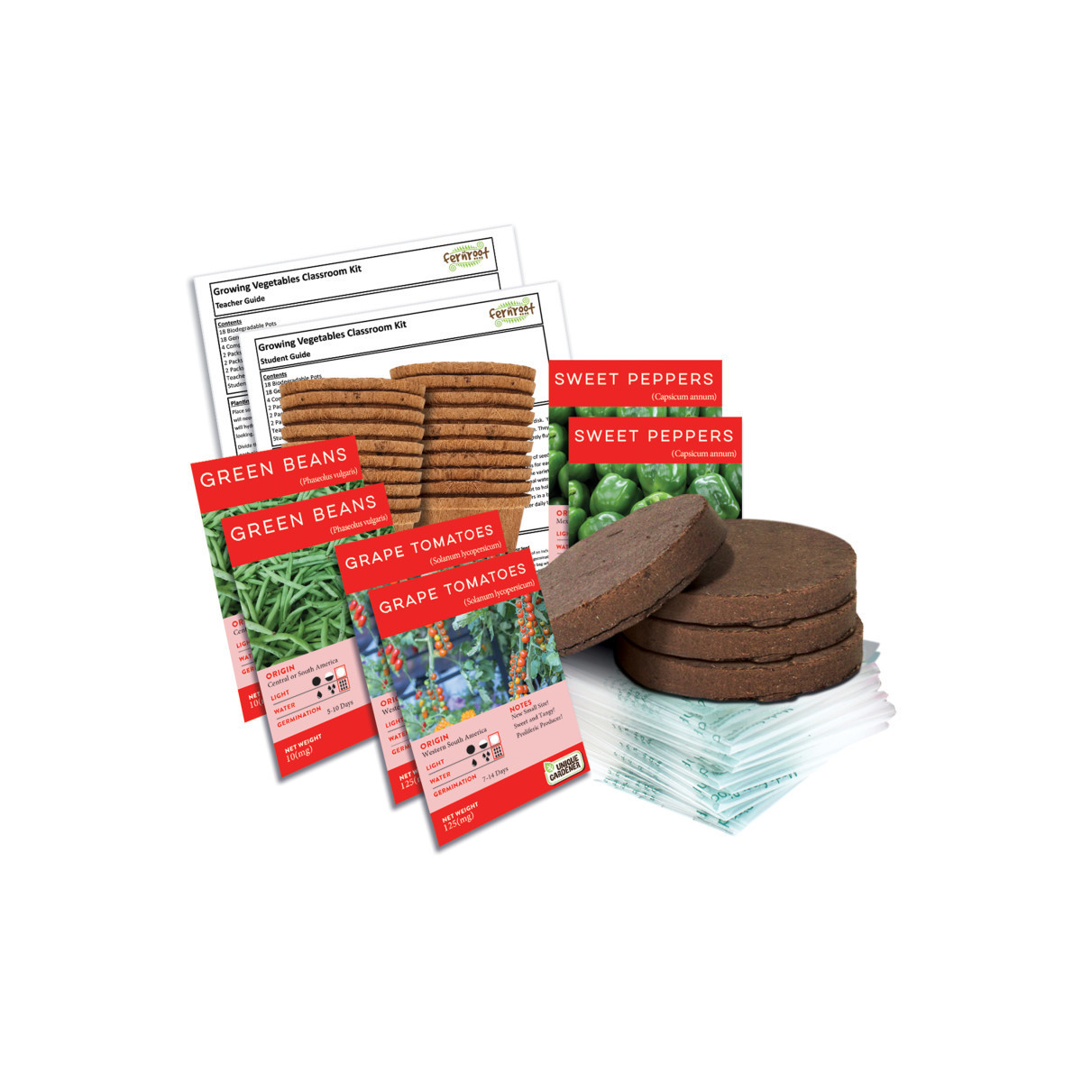 Sprout seeds for 3 kinds of vegetables and plant the seedlings and pot in the garden to grow and harvest vegetables. Comes with everything you need- just add water! For 18 students or groups. Contents include: 18 Biodegradable Pots, 18 Germination Bags, 2 Compressed Peat Disks, Green Bean Seed Pack 7g., Sweet Pepper Seed Pack 5mg., Grape Tomato Seed Pack 50mg., and Growing and Experiment Guide.