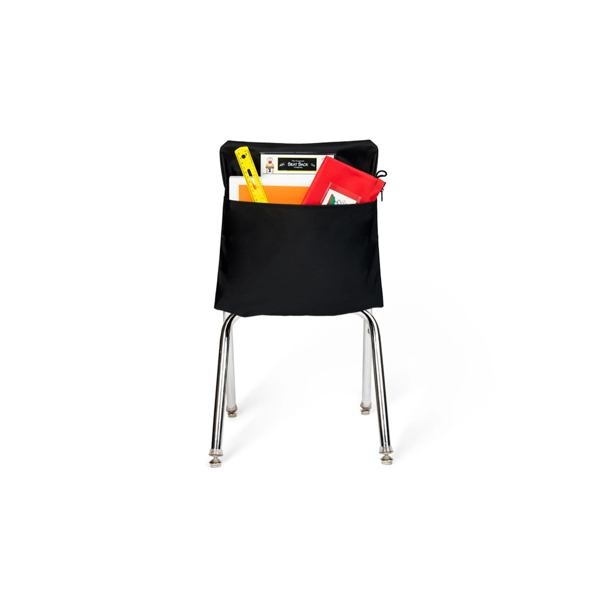 Seat Sack offers a Standard, 14-inch, black storage chair pocket for classroom organization that features a durable laminated fabric that is certified flame-resistant and machine washable. The Seat Sack student organizer has a 10-inch-deep pocket and a 2-inch gusset that offers ample storage space to accommodate tech devices, books, papers, school supplies and more. Fits chairs that measure 11 inches or less along the very top and widen to 14" at the pocket. Perfect for classroom storage, teaching vital organization skills and keeping classroom materials managed.