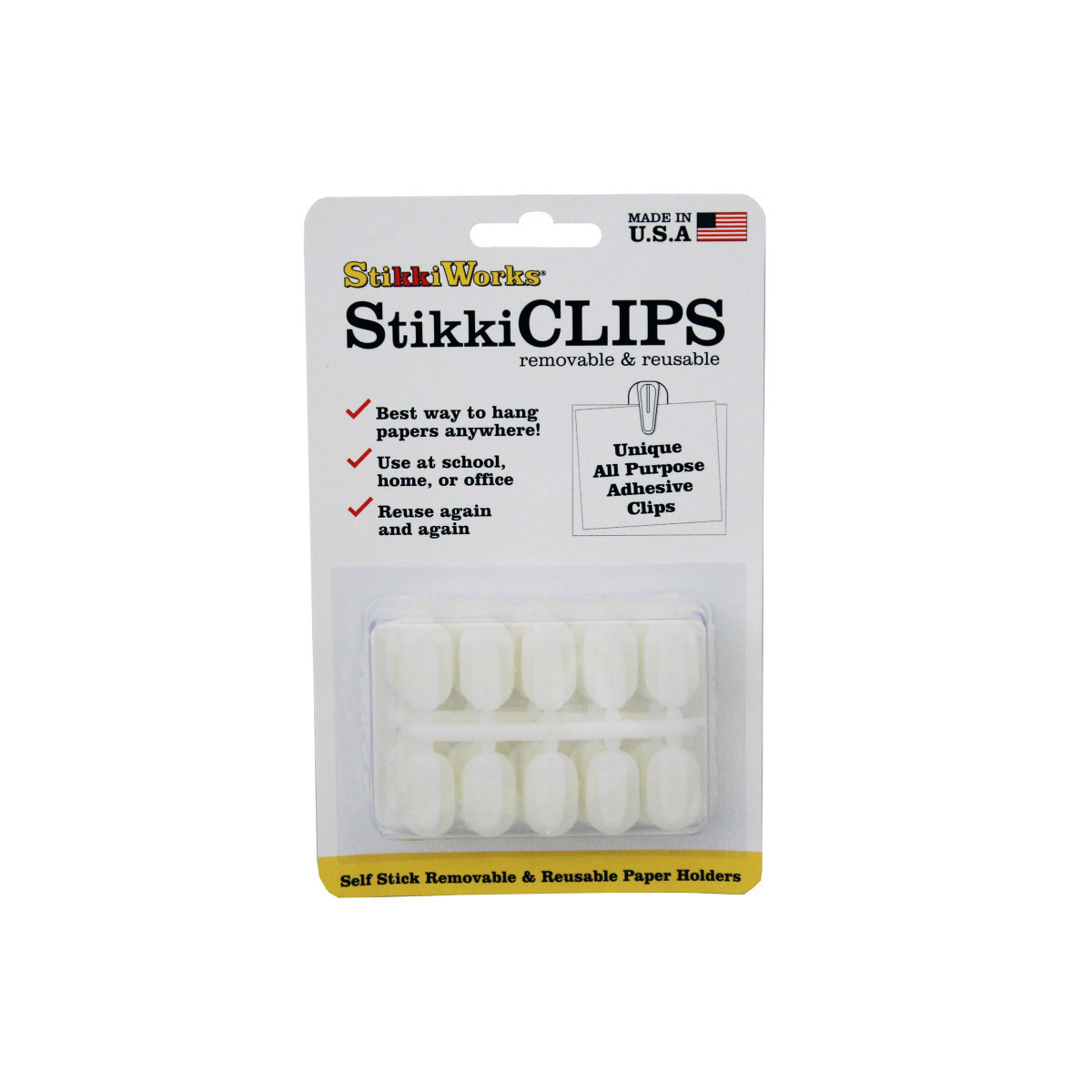 StikkiCLIPS™ are uniquely different, removable, reusable, fun, safe, effective and easy to use. These clips are perfect for hanging papers, notes, photos and more. Simply press the wax side onto any surface, slide paper under prong and twist to remove or re-position. Each pack includes 20 white all-purpose adhesive clips.