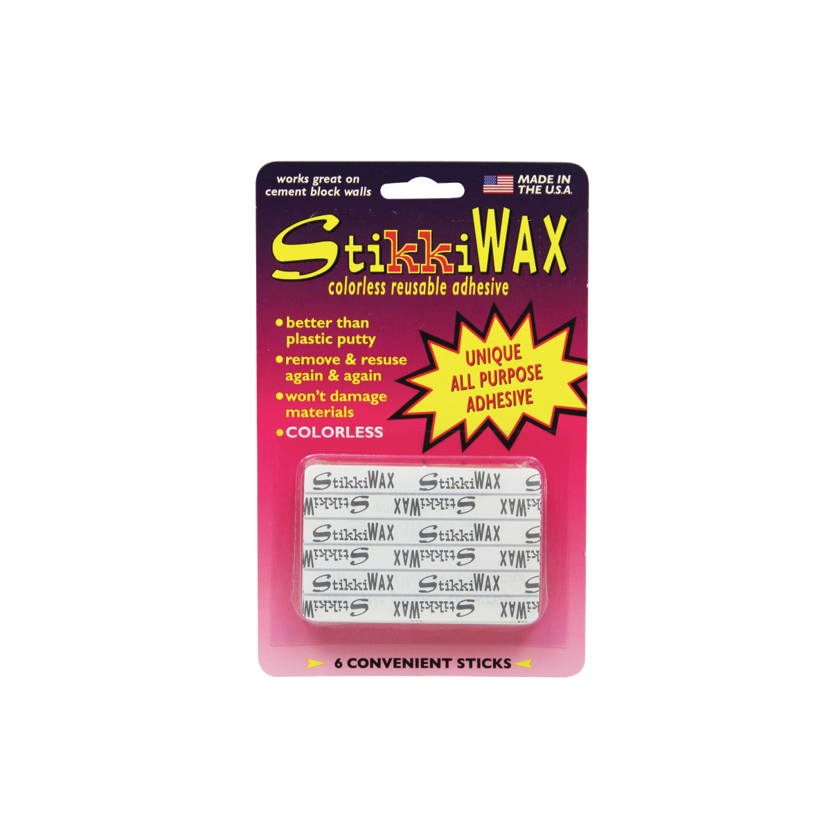 StikkiWAX™ Bars/Sticks are perfect for temporary and permanent holding, hanging, stabilizing and more! Either use the whole wax bar or cut to length. The colorless formula won't stain surfaces or materials and can be reused again and again. Each pack includes 6 all-purpose adhesive sticks.
