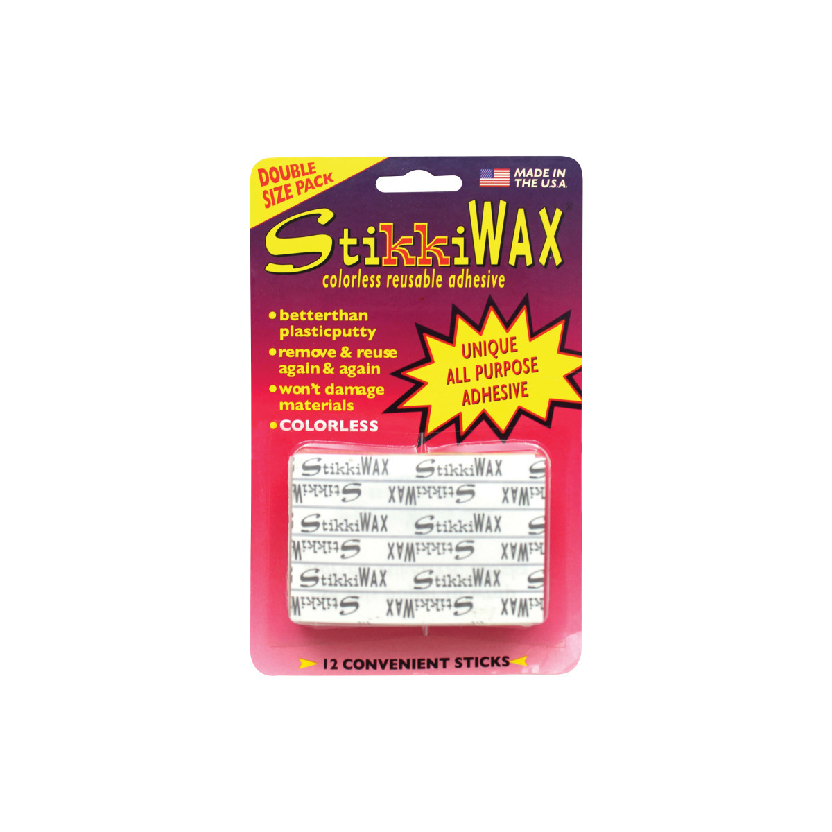StikkiWAX™ Bars/Sticks are perfect for temporary and permanent holding, hanging, stabilizing and more! Either use the whole wax bar or cut to length. The colorless formula won't stain surfaces or materials and can be reused again and again. Each pack includes 12 all-purpose adhesive sticks.