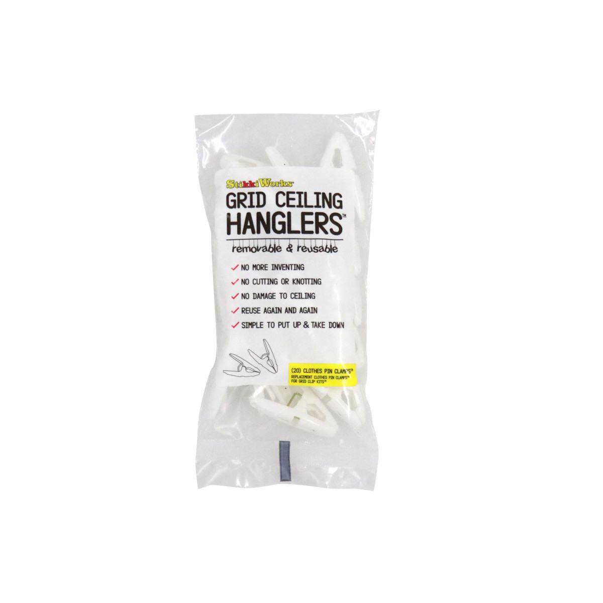 Clothes Pin Clamps™ are 2" clamps that have a strong grip for hanging papers, posters, models, mobiles and other lightweight to medium weighted objects. These clamps feature two holes for easy threading and work with Grid Clip Strings™ or can be used as replacement clamps for Grid Clip Kits™. Each bag includes 20 Clothes Pin Clamps™.