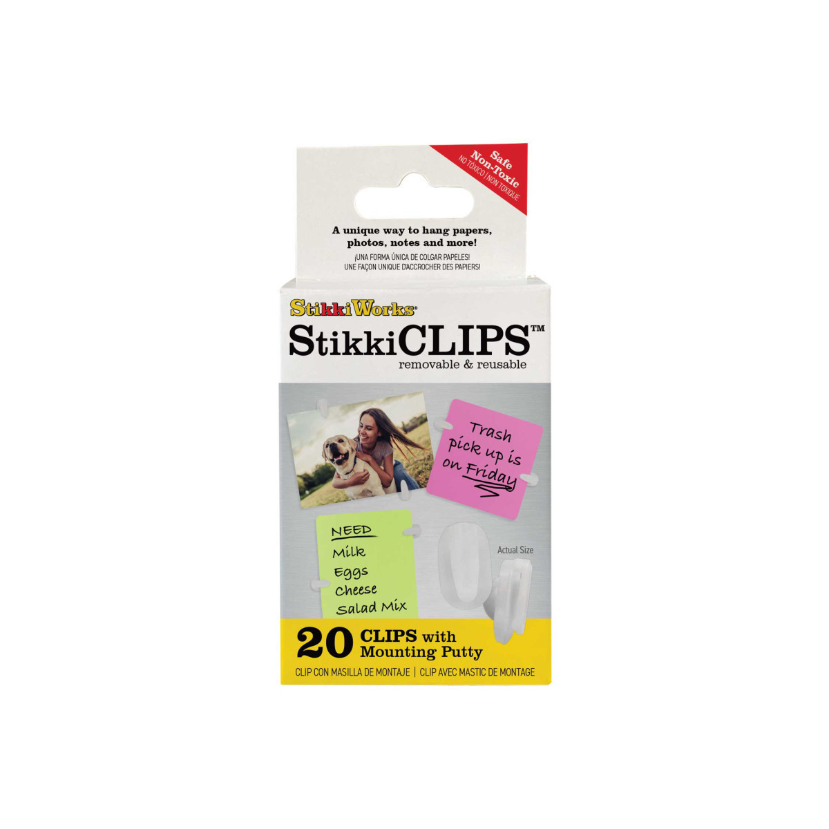 StikkiCLIPS™ are uniquely different, removable, reusable, fun, safe, effective and easy to use. These clips are perfect for hanging papers, notes, photos and more. Simply press the Putty side onto any surface, slide paper under prong and twist to remove or re-position. This package includes 20 white all-purpose adhesive clips.