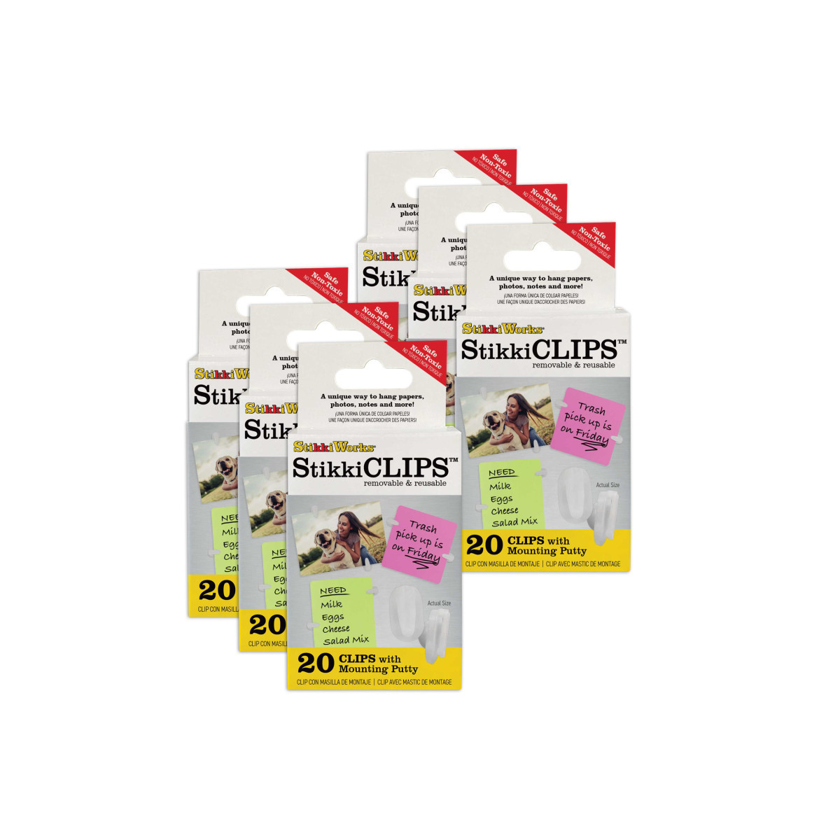StikkiCLIPS™ are uniquely different, removable, reusable, fun, safe, effective and easy to use. These clips are perfect for hanging papers, notes, photos and more. Simply press the Putty side onto any surface, slide paper under prong and twist to remove or re-position. Each pack includes 20 white all-purpose adhesive clips. Sold as 6 packs for a total of 120 clips.