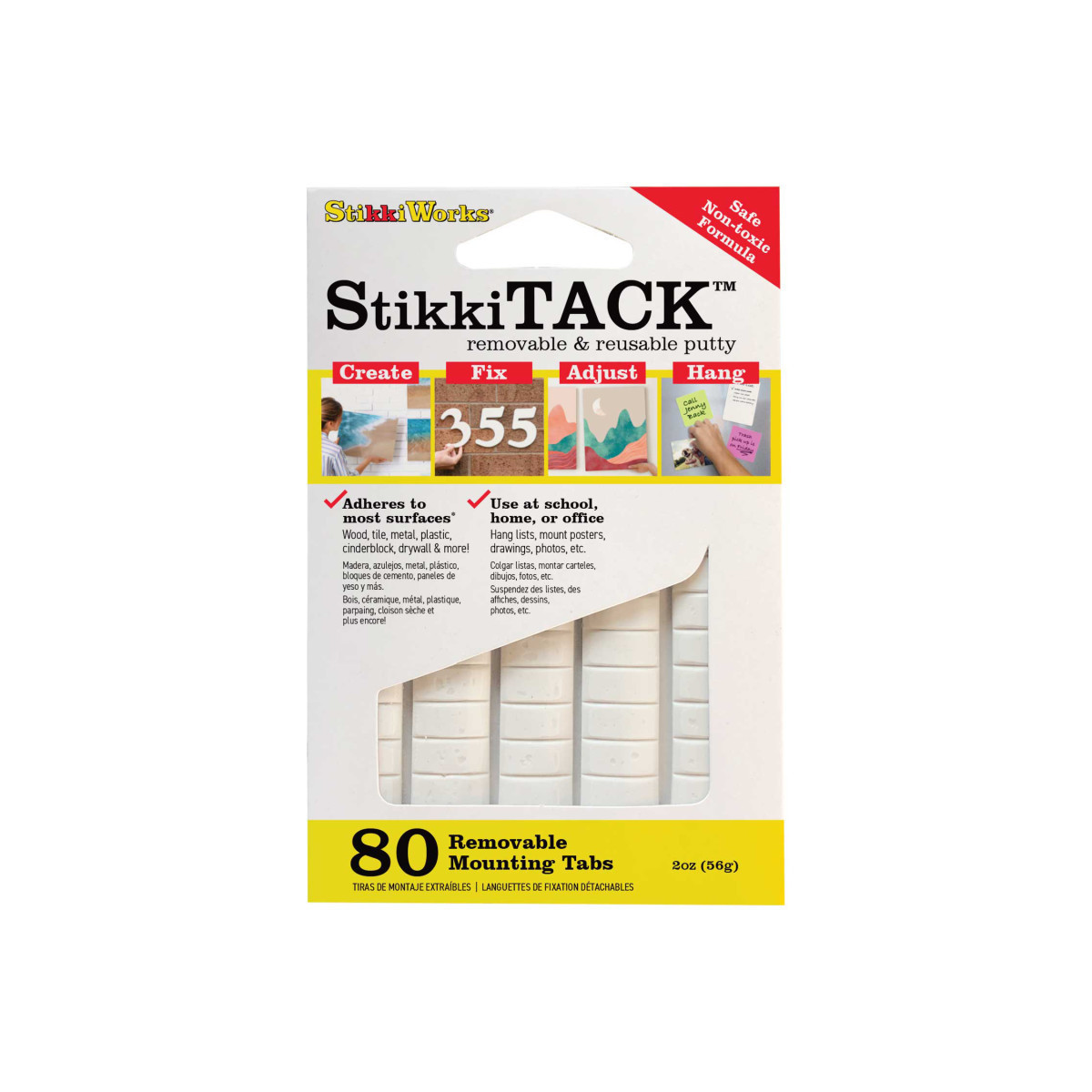StikkiTacks are an alternative to tapes, nails and staples; they’re perfect to hang artwork, photos, posters, and outdoor repairs without damaging walls. The mounting tabs are removable, reusable, safe, and easy to use. Just knead the putty until soft and warm, stick it on your project, and hang. Each pack comes with 80 tabs and is conveniently packed in an eco-friendly pouch for easy storage.