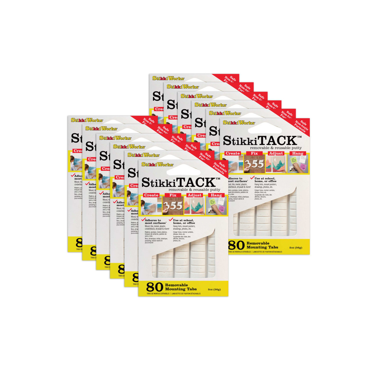 StikkiTacks are an alternative to tapes, nails and staples; they’re perfect to hang artwork, photos, posters, and outdoor repairs without damaging walls. The mounting tabs are removable, reusable, safe, and easy to use. Just knead the putty until soft and warm, stick it on your project, and hang. Each pack comes with 80 tabs and is conveniently packed in an eco-friendly pouch for easy storage. Sold as 12 packs for a total of 960 tabs.