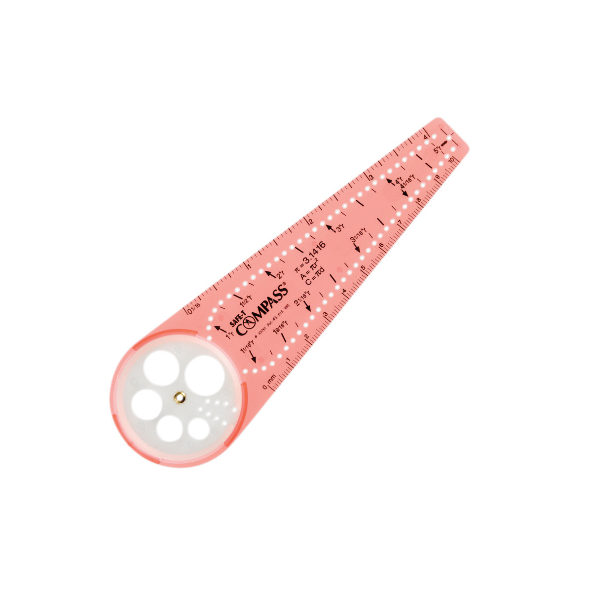 This durable, 6" compass can draw circles from .25" to 10" in diameter. Unique design eliminates the sharp point found on traditional compasses. Can be used with assorted writing instruments. Made with shatter-resistant SAFE-T® plastic. Includes two mini-rulers (inches and centimeters).