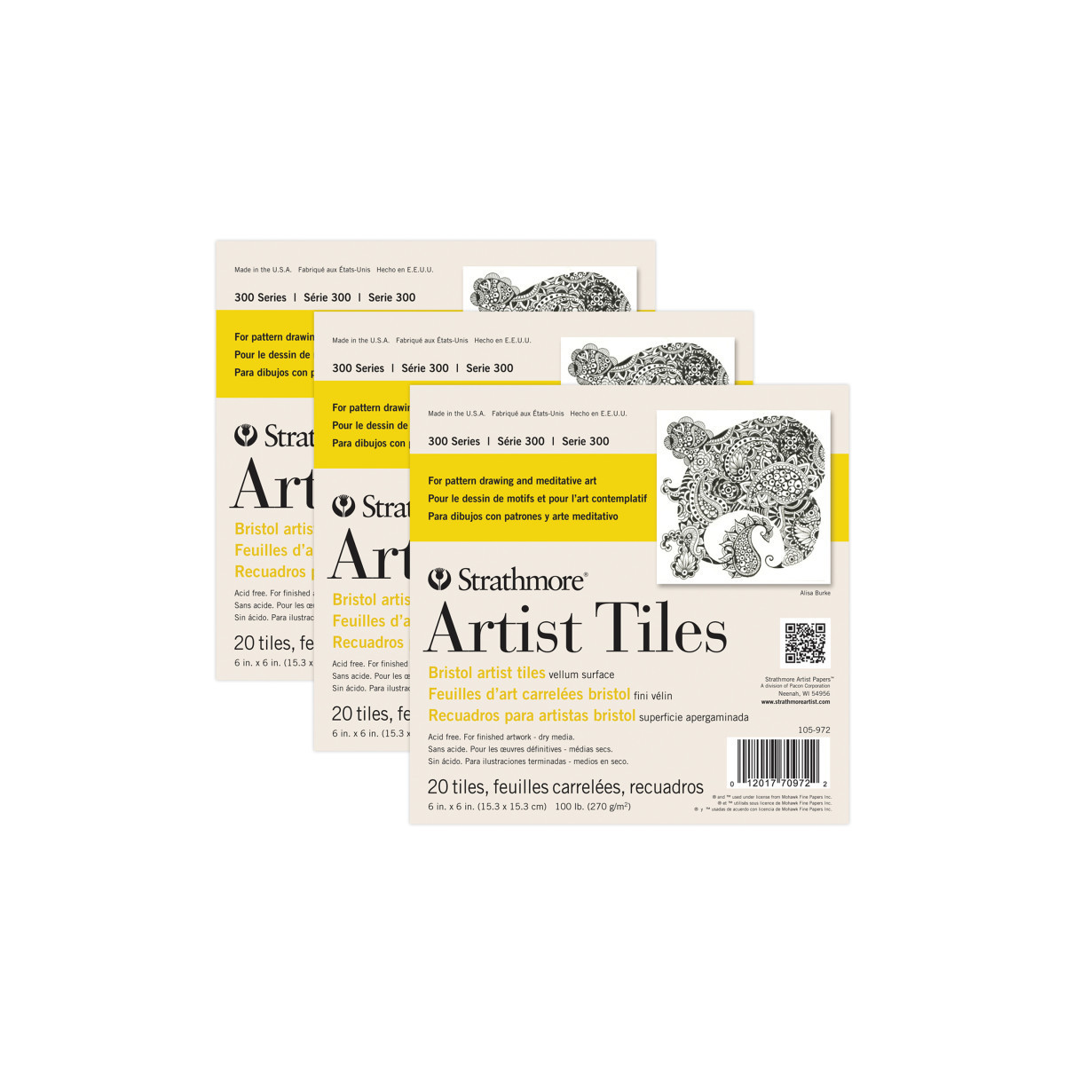 Experience the emotional benefits of art through pattern drawing on Strathmore Artist Tiles. Perfect for enjoying the creative, approachable process of combining repetitive marks, circles, lines, & forms to create small pieces of art. Available in pre-cut, convenient sizes, & appropriate paper surfaces. The history of Strathmore Paper Company began on St. Patrick's Day in 1892 when its founder, Horace Moses, opened the Mittineague Paper Mill in West Springfield, MA. Strathmore has been a leading supplier of fine art papers for 130 years & founded with the belief that better paper makes better art. Strathmore provides artists of all levels with one of the widest ranges of quality surfaces for producing beautiful works of art, no matter the choice of medium. Listening to the needs of artists & providing inspiration, education, & innovating new products is at the core of what matters to Strathmore. The Strathmore 300 Series provides art students & intermediate hobbyists a range of better quality paper for quick studies, technical practice & final pieces in art class or at home. Including a wide variety of surface types, artists working with watercolor paint, acrylic paint, oil paint, pastel, colored pencil, charcoal, marker, pen, ink & more have a curated pad customized for their needs. Trusted by art teachers & affordable for parents & students, the 300 Series is the best way to help build confidence in intermediate artists! Each pack includes 20 sheets. Sold as 3 packs for a total of 60 sheets.