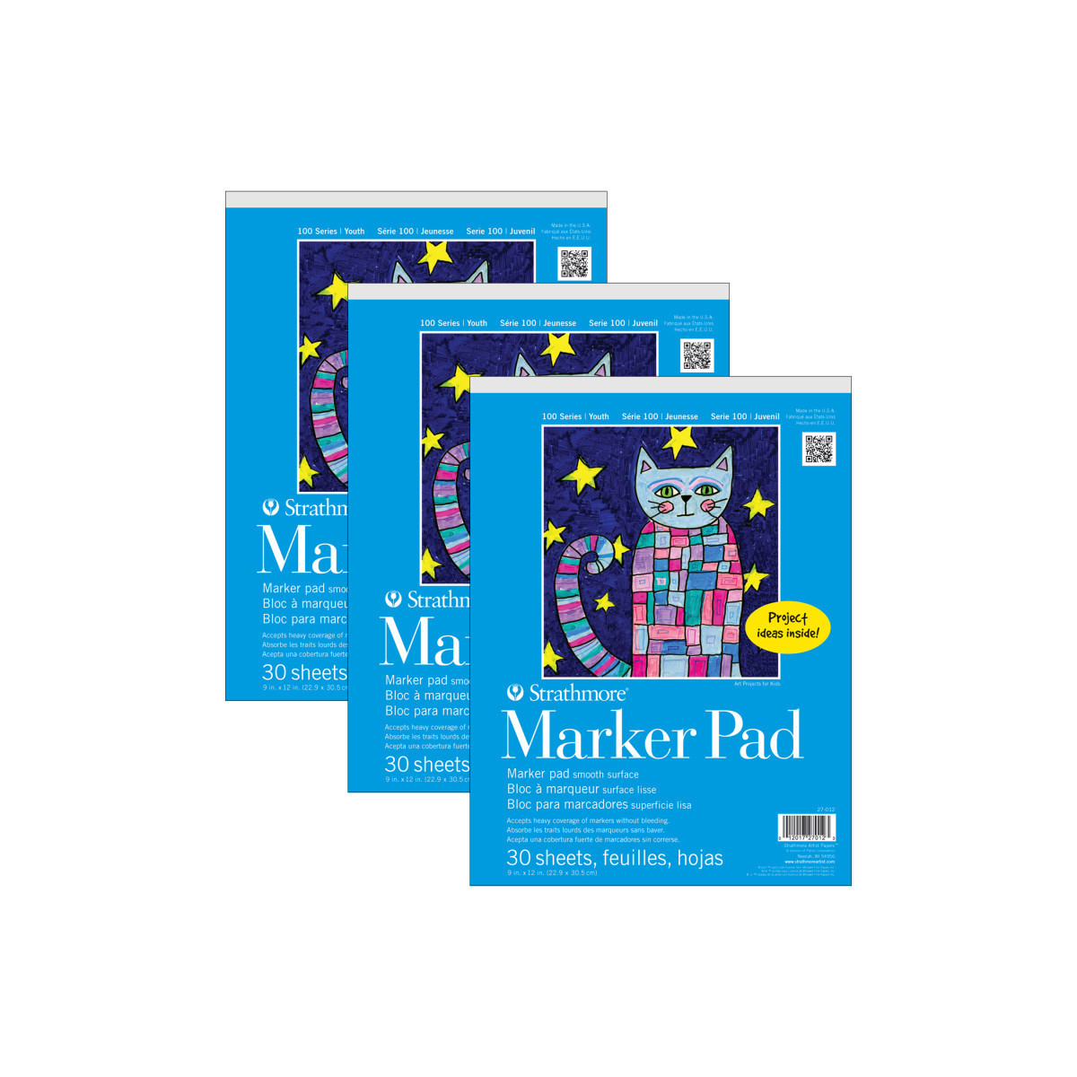 Marker paper for art class, daycare, craft nights & home school! Teach your kids the basics of drawing with a smooth, white paper made specifically for felt-tip markers—paper prevents bleeding & feathering so marker lines are crisp & clean. Explore the creative process with imaginative projects, investigate how a child sees the world around them & lay the ground work of shapes, light & shadow, color, outlines & proportions. The history of Strathmore Paper Company began on St. Patrick's Day in 1892 when its founder, Horace Moses, opened the Mittineague Paper Mill in West Springfield, MA. Strathmore has been a leading supplier of fine art papers for 130 years & founded with the belief that better paper makes better art. Strathmore provides artists of all levels with one of the widest ranges of quality surfaces for producing beautiful works of art, no matter the choice of medium. Listening to the needs of artists & providing inspiration, education, & innovating new products is at the core of what matters to Strathmore. Strathmore Paper Made for Kids! The 100 Series was created to nurture talent & ignite a lifelong love of art by providing artist quality materials at a young age. Designed for ages 5 & up, the paper types & features have been selected to enhance the creative process. Inspirational project ideas are included on the inside front cover of specially marked items. Sold as a pack of 3.
