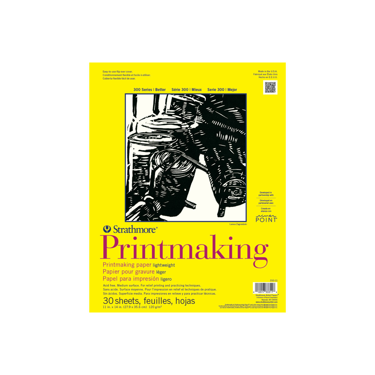 The Strathmore 300 Series Printmaking Pad contains a natural white paper made for printmaking. Ideal for relief printing with block or linocut, screen printing, practicing, & proofing; this paper utilizes a medium-textured surface that is both soft & durable to absorb large amounts of ink. The Strathmore 300 Series Printmaking Pad contains high levels of alpha cellulose wood fiber to improve absorption while making your images pop. The history of Strathmore Paper Company began on St. Patrick's Day in 1892 when its founder, Horace Moses, opened the Mittineague Paper Mill in West Springfield, MA. Strathmore has been a leading supplier of fine art papers for 130 years & founded with the belief that better paper makes better art. Strathmore provides artists of all levels with one of the widest ranges of quality surfaces for producing beautiful works of art, no matter the choice of medium. Listening to the needs of artists & providing inspiration, education, & innovating new products is at the core of what matters to Strathmore. The Strathmore 300 Series provides art students & intermediate hobbyists a range of better quality paper for quick studies, technical practice & final pieces in art class or at home. Including a wide variety of surface types, artists working with watercolor paint, acrylic paint, oil paint, pastel, colored pencil, charcoal, marker, pen, ink & more have a curated pad customized for their needs. Trusted by art teachers & affordable for parents & students, the 300 Series is the best way to help build confidence in intermediate artists!