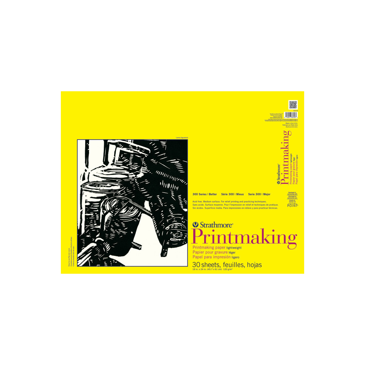 The Strathmore 300 Series Printmaking Pad contains a natural white paper made for printmaking. Ideal for relief printing with block or linocut, screen printing, practicing, & proofing; this paper utilizes a medium-textured surface that is both soft & durable to absorb large amounts of ink. The Strathmore 300 Series Printmaking Pad contains high levels of alpha cellulose wood fiber to improve absorption while making your images pop. The history of Strathmore Paper Company began on St. Patrick's Day in 1892 when its founder, Horace Moses, opened the Mittineague Paper Mill in West Springfield, MA. Strathmore has been a leading supplier of fine art papers for 130 years & founded with the belief that better paper makes better art. Strathmore provides artists of all levels with one of the widest ranges of quality surfaces for producing beautiful works of art, no matter the choice of medium. Listening to the needs of artists & providing inspiration, education, & innovating new products is at the core of what matters to Strathmore. The Strathmore 300 Series provides art students & intermediate hobbyists a range of better quality paper for quick studies, technical practice & final pieces in art class or at home. Including a wide variety of surface types, artists working with watercolor paint, acrylic paint, oil paint, pastel, colored pencil, charcoal, marker, pen, ink & more have a curated pad customized for their needs. Trusted by art teachers & affordable for parents & students, the 300 Series is the best way to help build confidence in intermediate artists!