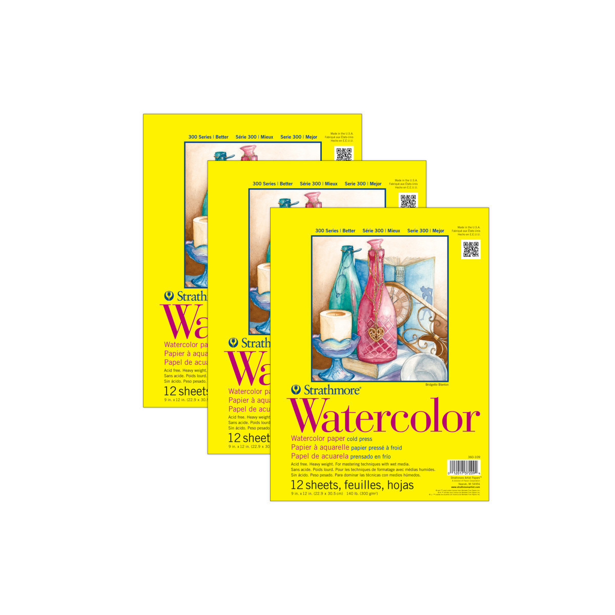 Strathmore 300 Series Watercolor Pad, Cold Pressed, Tape Binding, 12 Sheet, 9x12 inch, Pack of 3