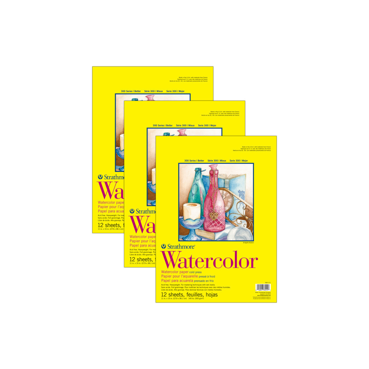 Strathmore 300 Series Watercolor Pad, Cold Pressed, Tape Binding, 12 Sheet, 11x15 inch, Pack of 3