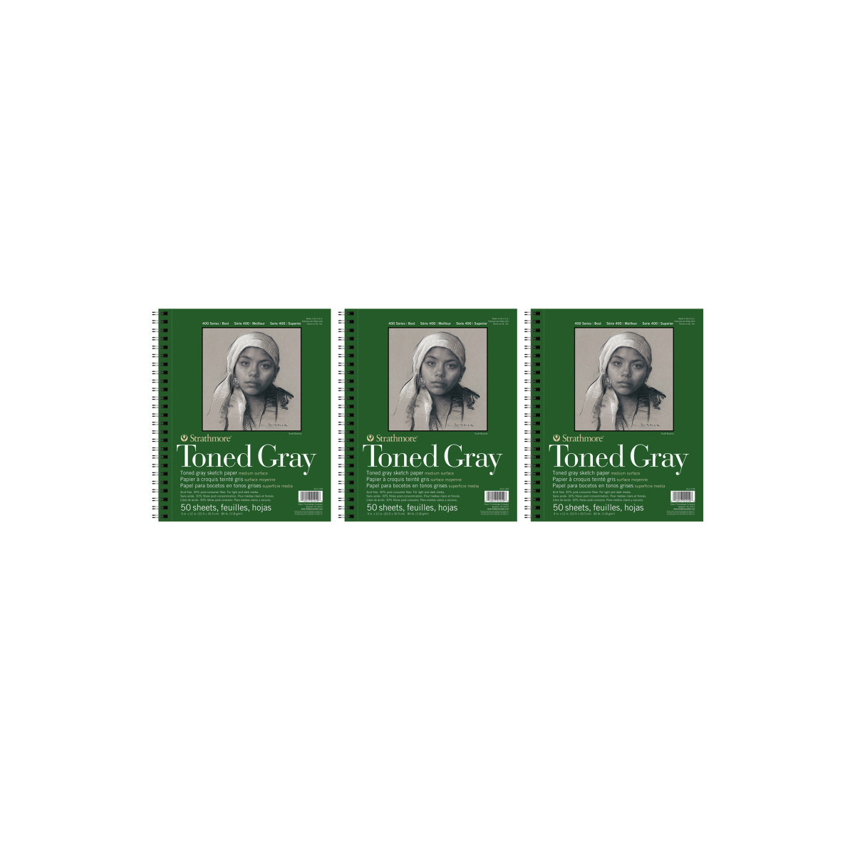 Strathmore 400 Series Sketch Pad, Recycled, Toned Gray, Side Wire Binding, 50 Sheet, 9x12 inch, Pack of 3