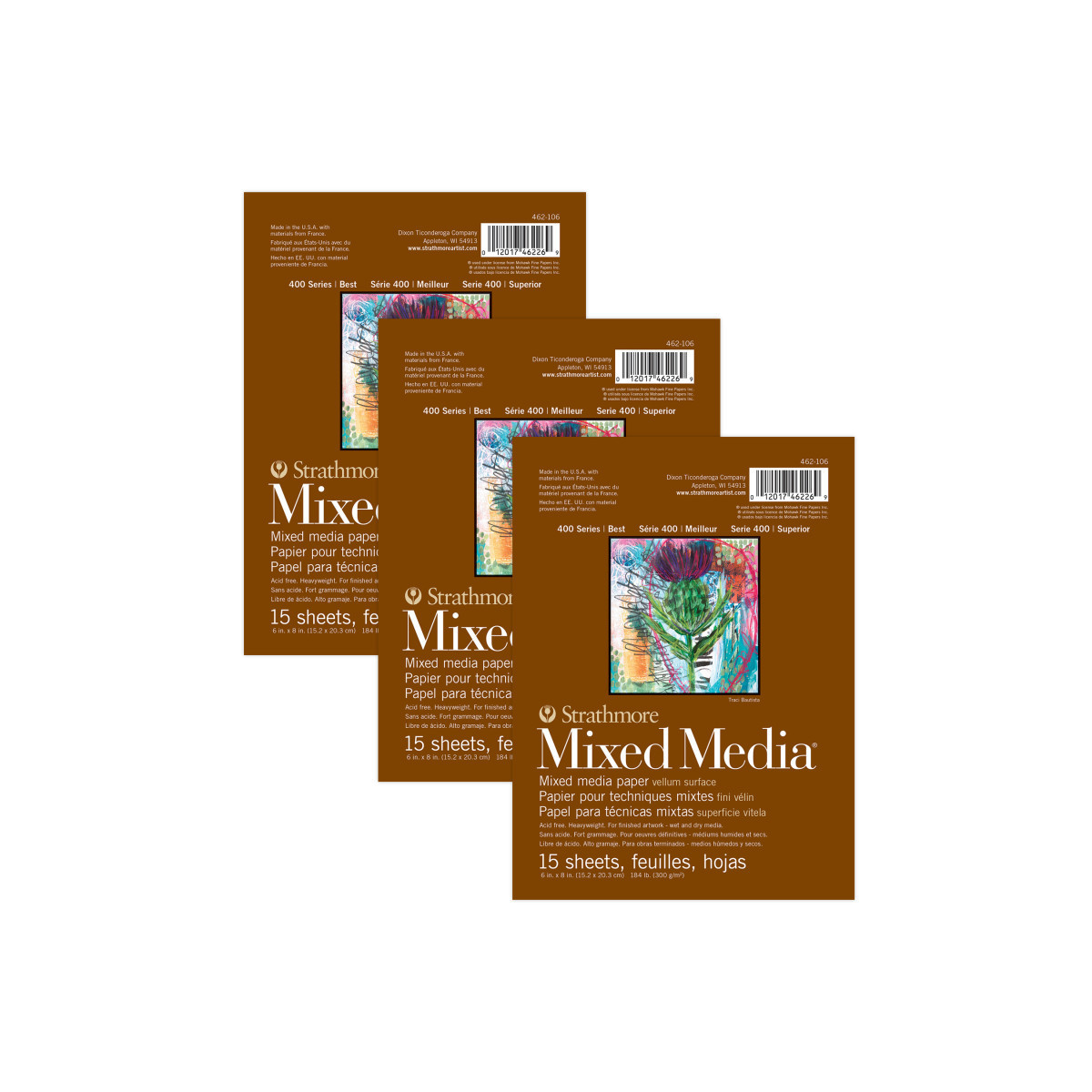 Introducing the Strathmore 400 Series Mixed Media Paper—a versatile surface for professional artists, ready to handle whatever your creativity throws at it. By combining the characteristics of watercolor paper with the finish of a drawing sheet, we've created the ultimate paper for artists to confidently explore watercolor washes, ink lines, & layers of pastel or colored pencil without fear of warping or tearing. Freely create richly dynamic pieces that truly stand out. The history of Strathmore Paper Company began on St. Patrick's Day in 1892 when its founder, Horace Moses, opened the Mittineague Paper Mill in West Springfield, MA. Strathmore has been a leading supplier of fine art papers for 130 years & founded with the belief that better paper makes better art. Strathmore provides artists of all levels with one of the widest ranges of quality surfaces for producing beautiful works of art, no matter the choice of medium. Listening to the needs of artists & providing inspiration, education, & innovating new products is at the core of what matters to Strathmore. The Strathmore 400 Series, easily recognized by its iconic brown cover, has been a staple in the hands of art students & professional artists. Known for its dependable quality & time-tested durability, this series of art paper provides high school art students, college art students, dedicated hobbyists & career artists a range of surfaces from practice to final pieces. Artists working with watercolor paint, acrylic paint, oil paint, pastel, colored pencil, charcoal, marker, pen, ink & more have a curated pad customized for their needs. Confidently create showcase-worthy pieces for galleries, competitions & online market places with this beloved brand! Sold as a pack of 3.