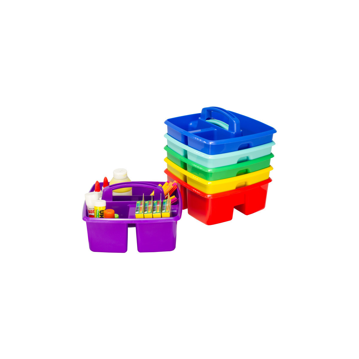 Sort your supplies for easy use and storage. The Caddy has 3 compartments (1 large and 2 small). The rounded handle has no sharp edges. Completely washable and dishwasher safe. Take your supplies from the closet to the work table quickly and simply. Caddies measure 9.25"L x 9.25"W x 5.25"H. Large compartment measures 8.25"L x 3.5"W x 3.5"H. Small compartments measure 3.6"L x 3.6"W x 3.5"H. Sold as a pack of 6 caddies in assorted colors.