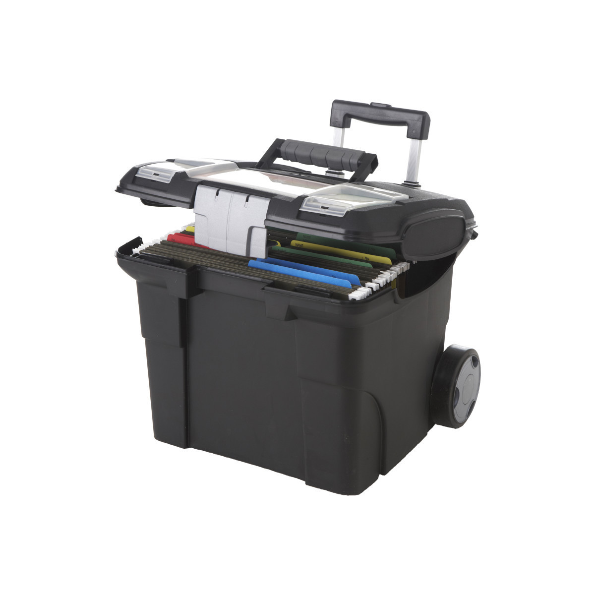 Transport your files between rooms or workplaces effortlessly with the Premium File Box. The durable polypropylene construction combined with the wheels and long handle make it easy to move up to 30 lbs. of files. The top compartment with a clear lid conveniently keeps your small supplies visible and accessible. The boxes are made from a minimum of 25% post-consumer recycled materials for a more sustainable product.