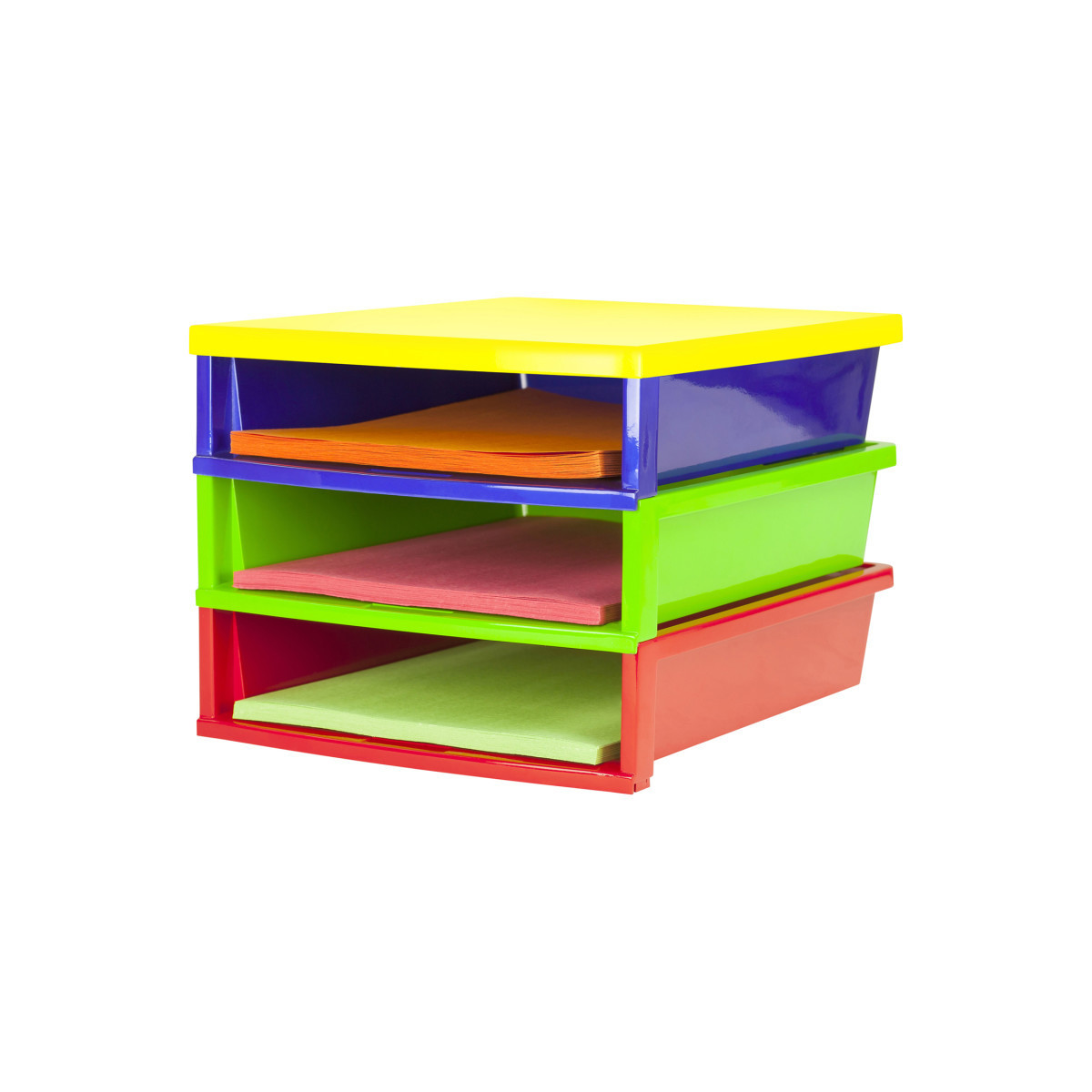 Sorter snaps together in seconds with no tools required. It is made of a durable plastic which outlasts cardboard. It is sturdy enough to hold a 500 sheets of 9x12 construction paper in each compartment.