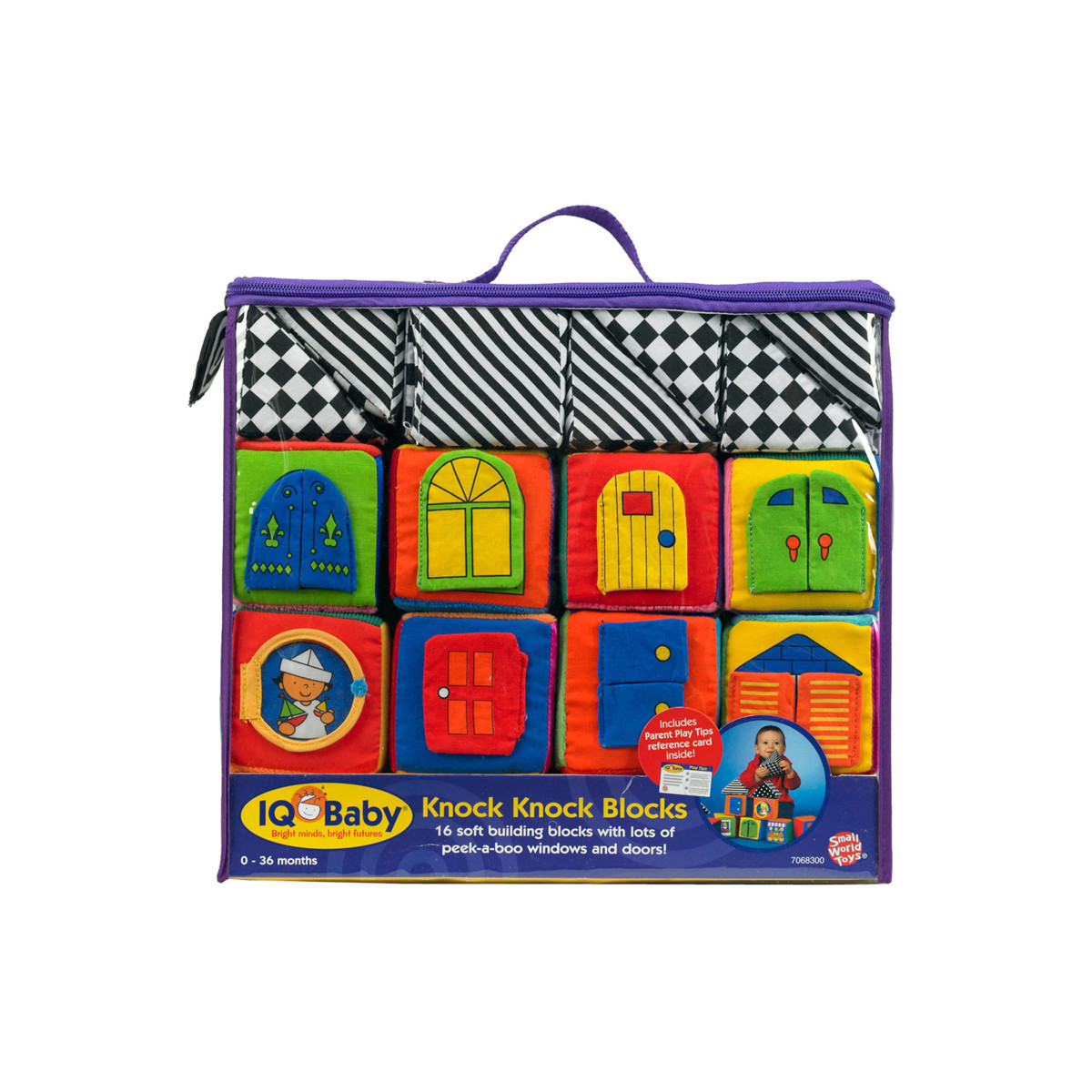 Sixteen soft building blocks with lots of peek-a-boo windows