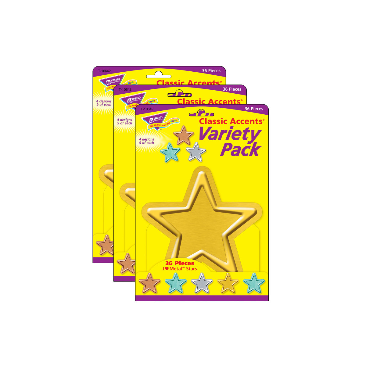 Packed with personality! Endless ways to energize, delight, engage. Label storage centers & lockers, create eye-catching displays, showcase student work, inspire creativity, and reward success. Coordinates with I ♥ Metal™ Collection. Precut and ready to use. Accents are 5½" tall. Colors included are gold, silver, copper and patina. Each pack includes 36 accents. Sold as 3 packs for a total of 108 accents.
